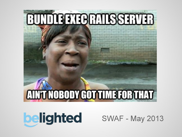lot of things built-in. • Easily skinnable. • Awesome completion. Betterer : tmux. • All the things on the left. • Remote sessions. • Shortcut madness. • Vim-like customization. https://github.com/robbyrussell/oh-my-zsh http://railscasts.com/episodes/308-oh-my-zsh