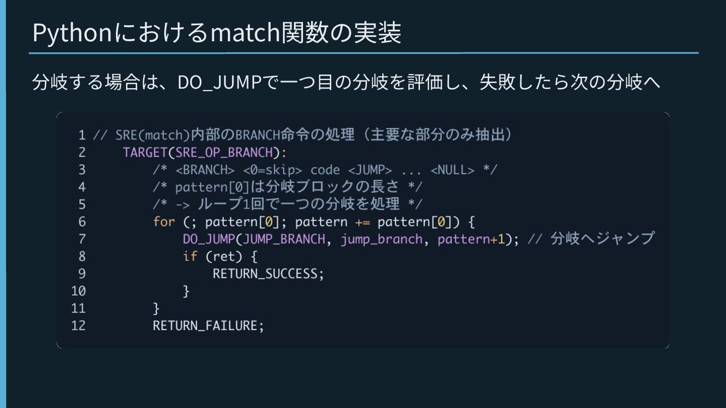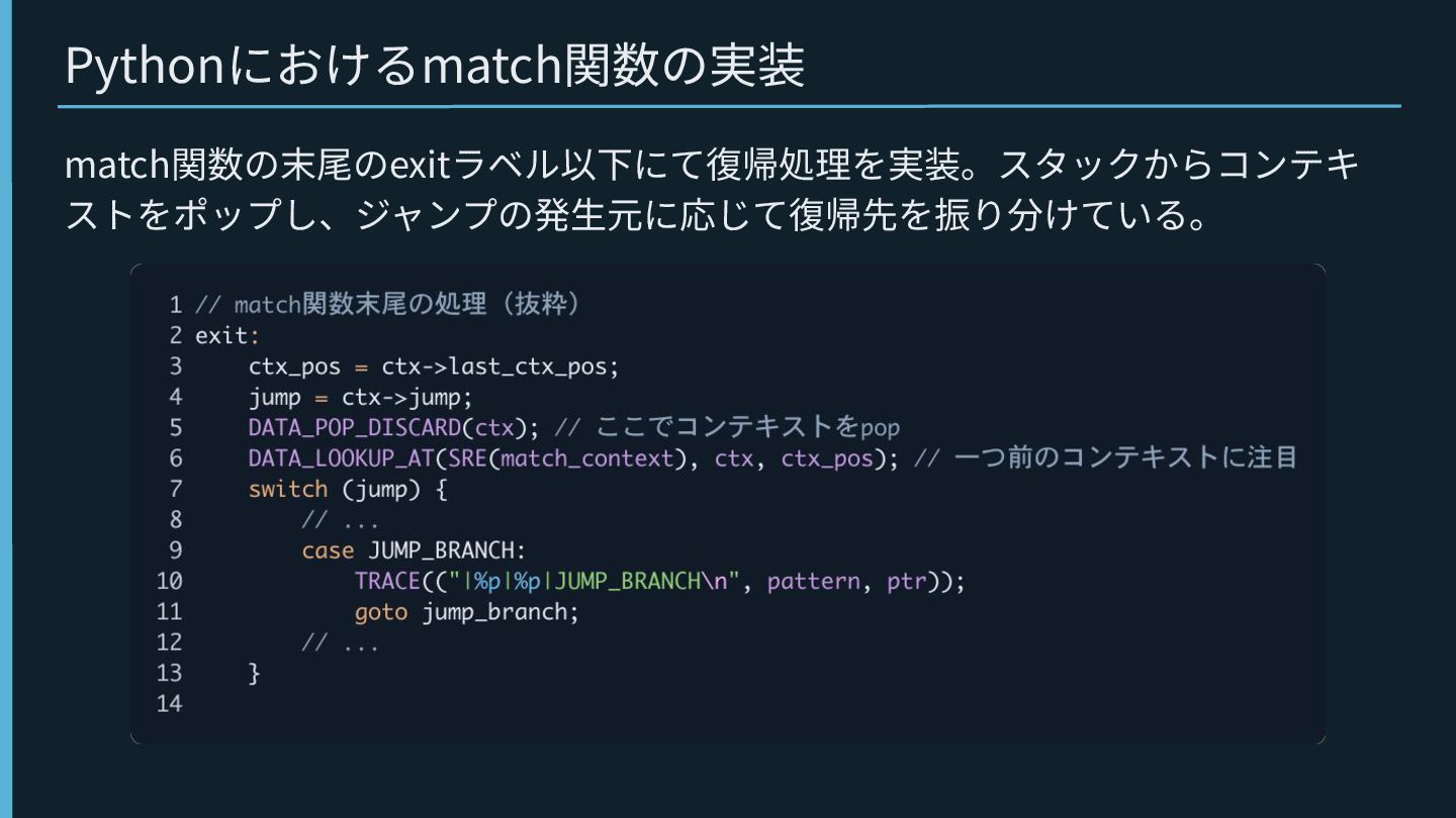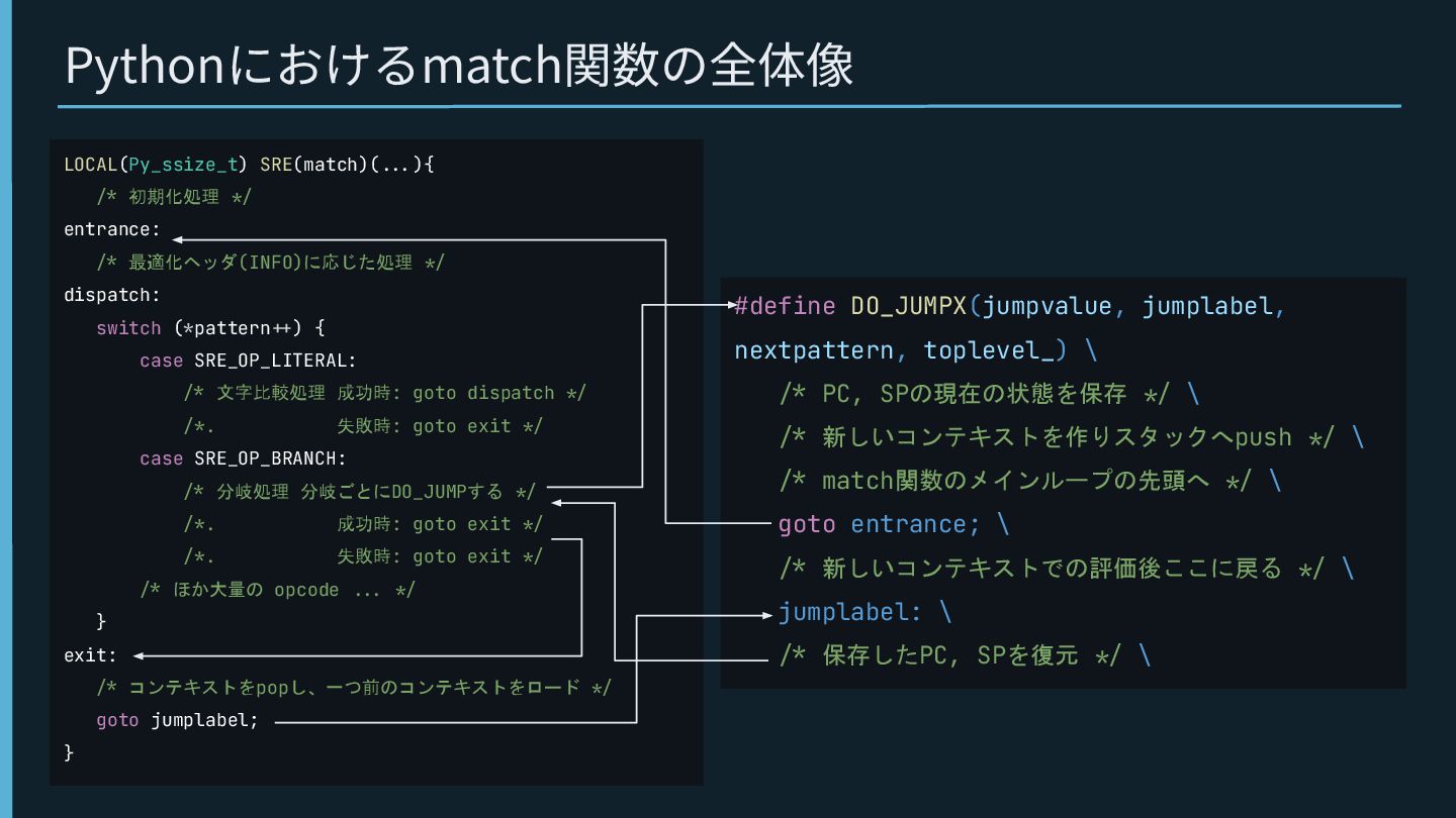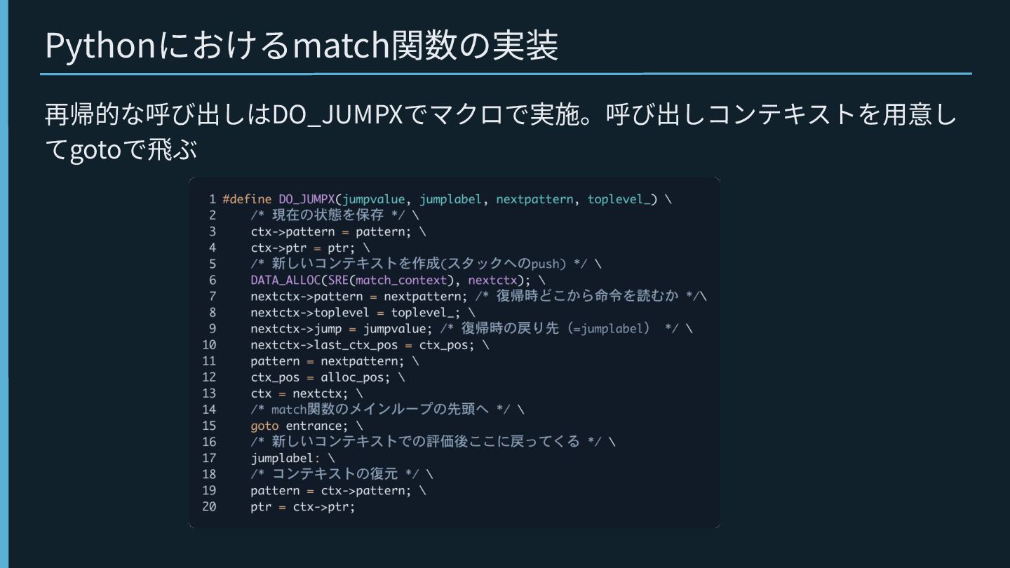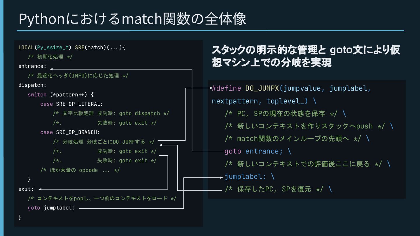 dispatch: switch (*pattern*+) { case SRE_OP_LITERAL: ** 文字比較処理 成功時: goto dispatch */ /*. 失敗時: goto exit */ case SRE_OP_BRANCH: ** 分岐処理 分岐ごとにDO_JUMPする */ /*. 成功時: goto exit */ /*. 失敗時: goto exit */ ** ほか大量の opcode **. */ } exit: ** コンテキストをpopし、一つ前のコンテキストをロード */ goto jumplabel; } #define DO_JUMPX(jumpvalue, jumplabel, nextpattern, toplevel_) \ ** PC, SPの現在の状態を保存 */ \ ** 新しいコンテキストを作りスタックへpush */ \ ** match関数のメインループの先頭へ */ \ goto entrance; \ ** 新しいコンテキストでの評価後ここに戻る */ \ jumplabel: \ ** 保存したPC, SPを復元 */ \ スタックの明示的な管理と goto文により仮 想マシン上での分岐を実現