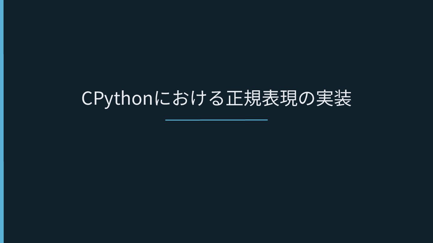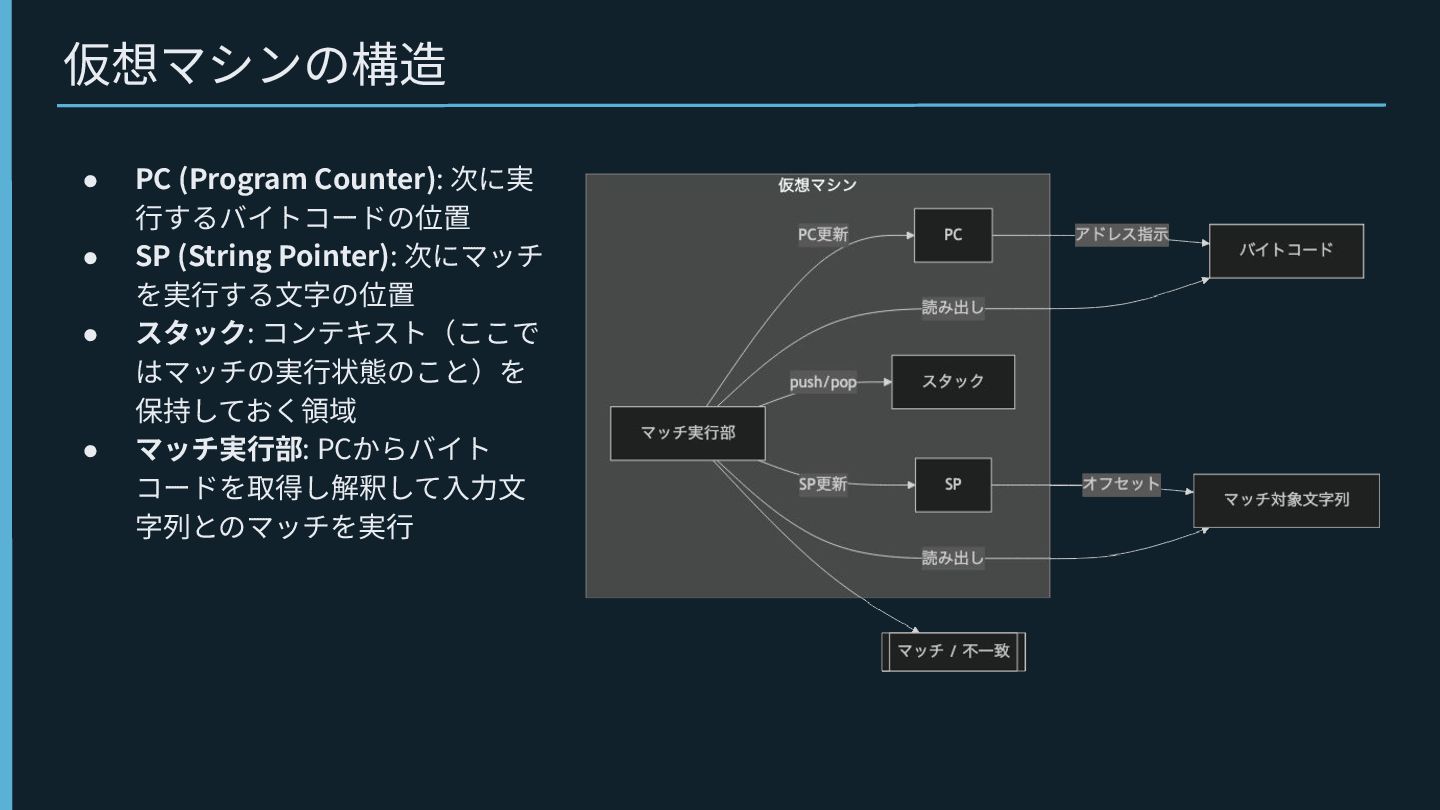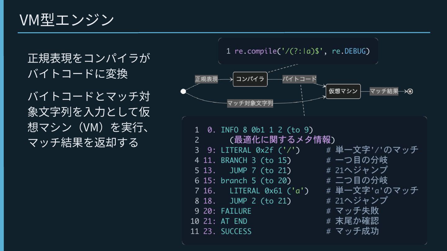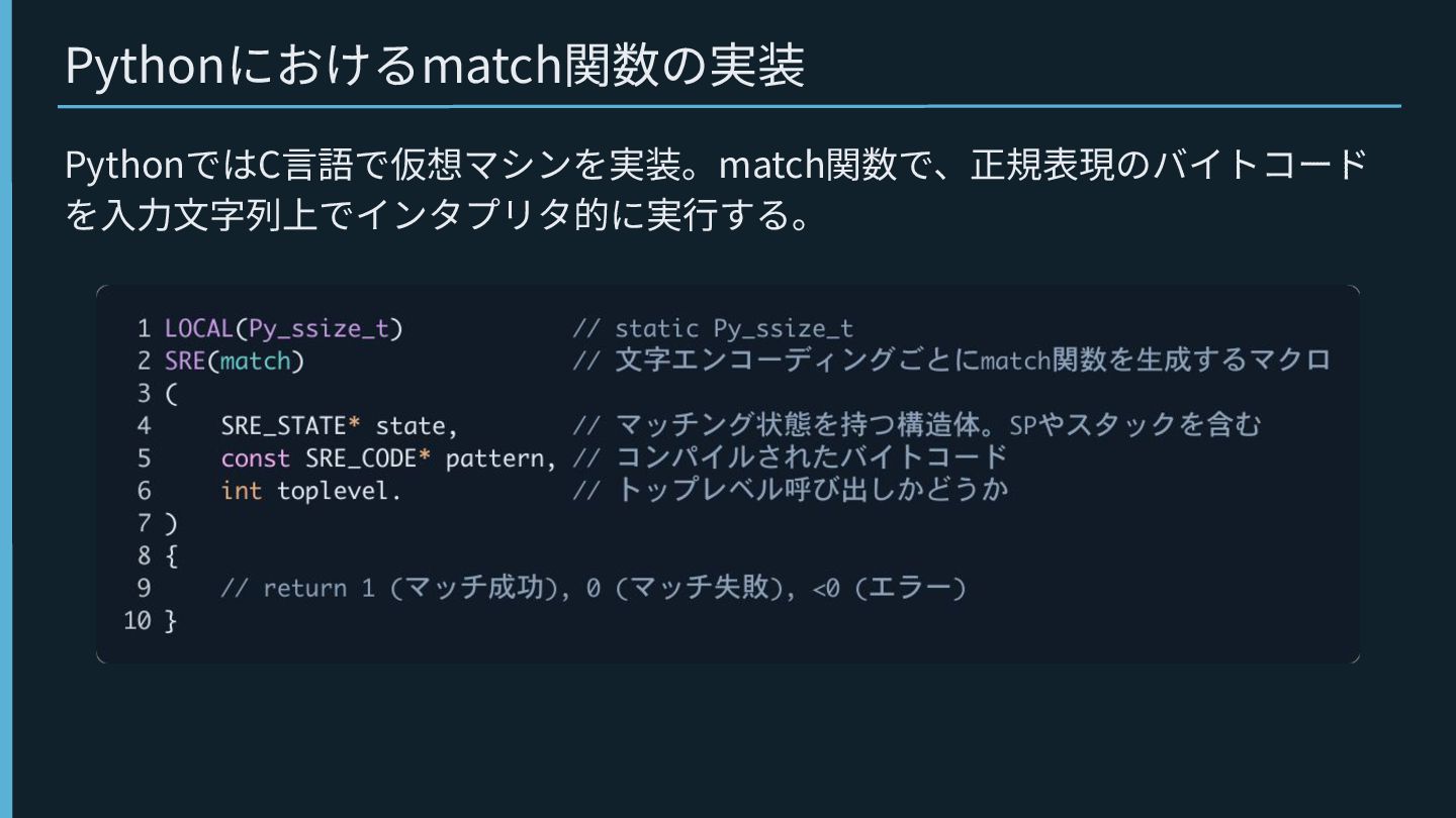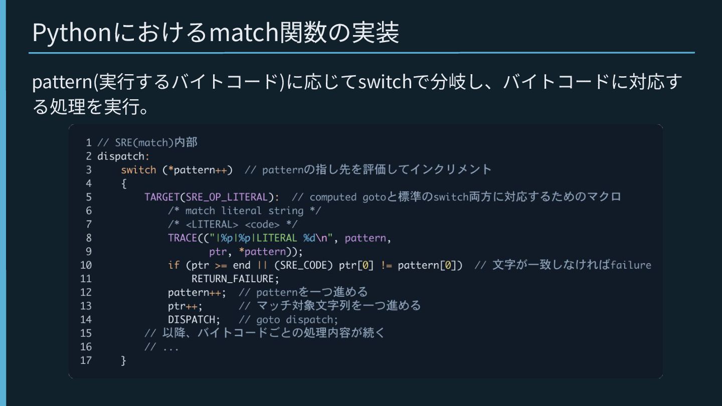 dispatch: switch (*pattern*+) { case SRE_OP_LITERAL: ** 文字比較処理 成功時: goto dispatch */ /*. 失敗時: goto exit */ case SRE_OP_BRANCH: ** 分岐処理 分岐ごとにDO_JUMPする */ /*. 成功時: goto exit */ /*. 失敗時: goto exit */ ** ほか大量の opcode **. */ } exit: ** コンテキストをpopし、一つ前のコンテキストをロード */ goto jumplabel; } #define DO_JUMPX(jumpvalue, jumplabel, nextpattern, toplevel_) \ ** PC, SPの現在の状態を保存 */ \ ** 新しいコンテキストを作りスタックへpush */ \ ** match関数のメインループの先頭へ */ \ goto entrance; \ ** 新しいコンテキストでの評価後ここに戻る */ \ jumplabel: \ ** 保存したPC, SPを復元 */ \ スタックの明示的な管理と goto文により仮 想マシン上での分岐を実現