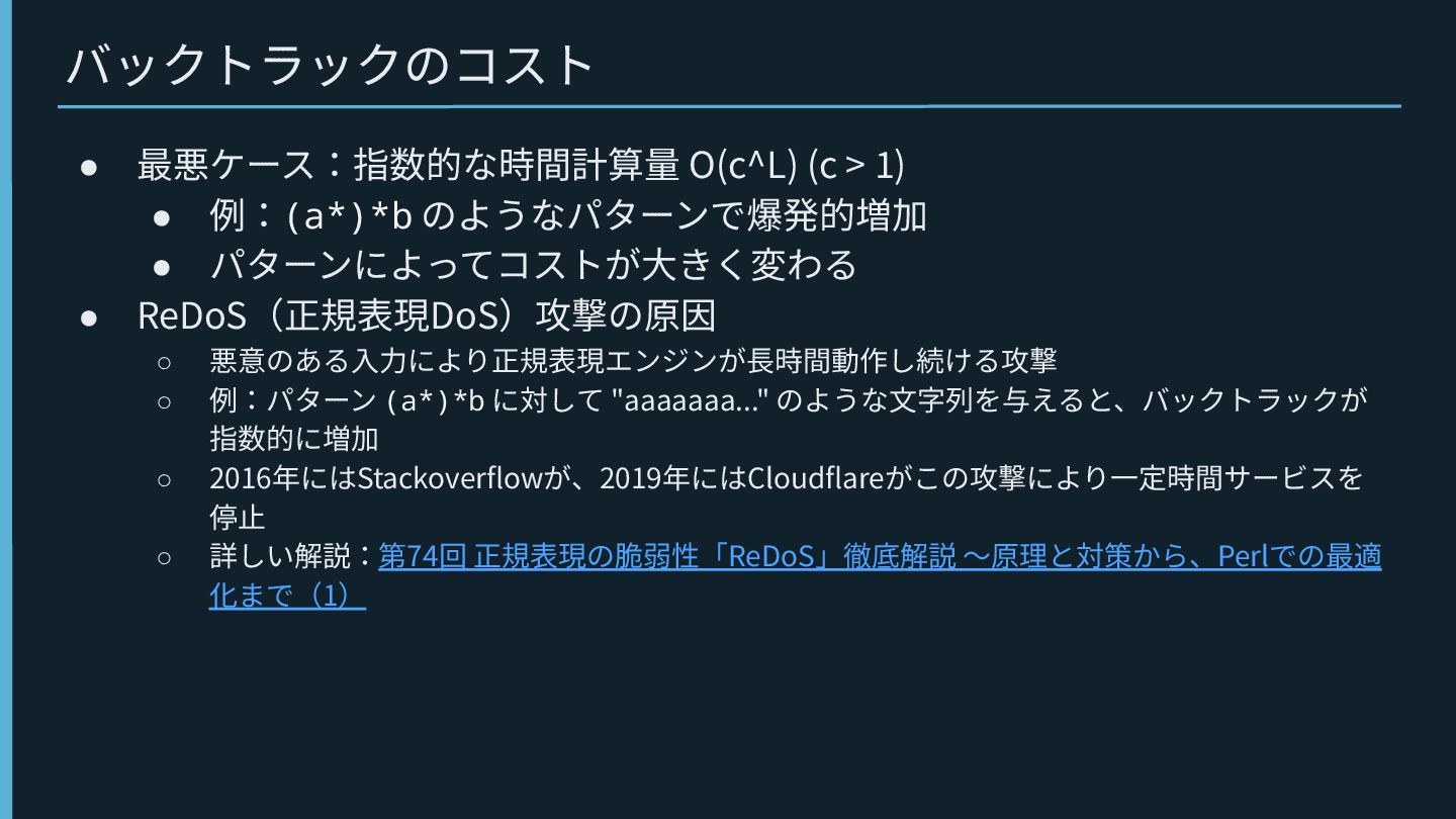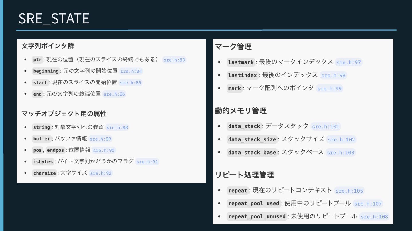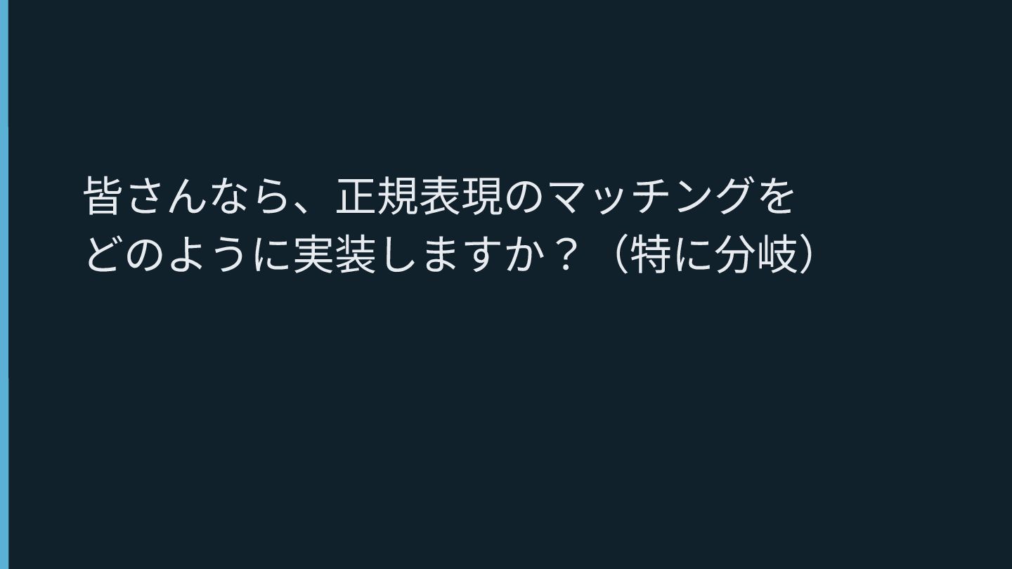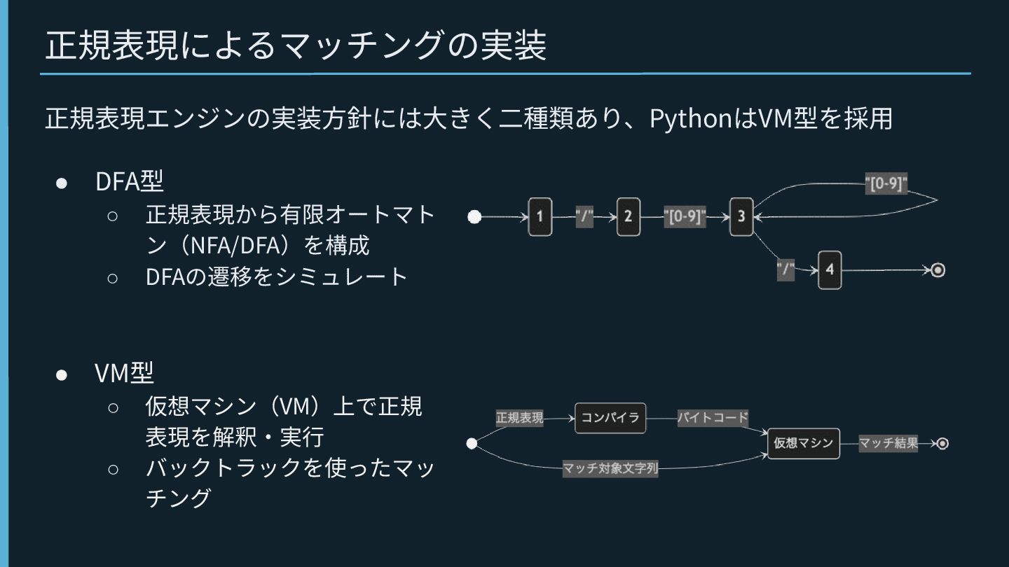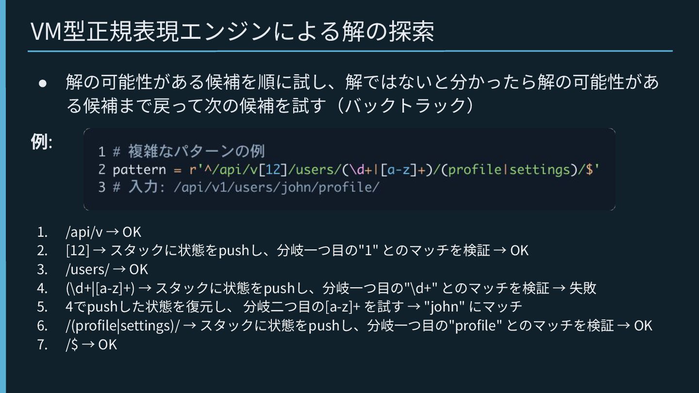 dispatch: switch (*pattern*+) { case SRE_OP_LITERAL: ** 文字比較処理 成功時: goto dispatch */ /*. 失敗時: goto exit */ case SRE_OP_BRANCH: ** 分岐処理 分岐ごとにDO_JUMPする */ /*. 成功時: goto exit */ /*. 失敗時: goto exit */ ** ほか大量の opcode **. */ } exit: ** コンテキストをpopし、一つ前のコンテキストをロード */ goto jumplabel; } #define DO_JUMPX(jumpvalue, jumplabel, nextpattern, toplevel_) \ ** PC, SPの現在の状態を保存 */ \ ** 新しいコンテキストを作りスタックへpush */ \ ** match関数のメインループの先頭へ */ \ goto entrance; \ ** 新しいコンテキストでの評価後ここに戻る */ \ jumplabel: \ ** 保存したPC, SPを復元 */ \ スタックの明示的な管理と goto文により仮 想マシン上での分岐を実現
