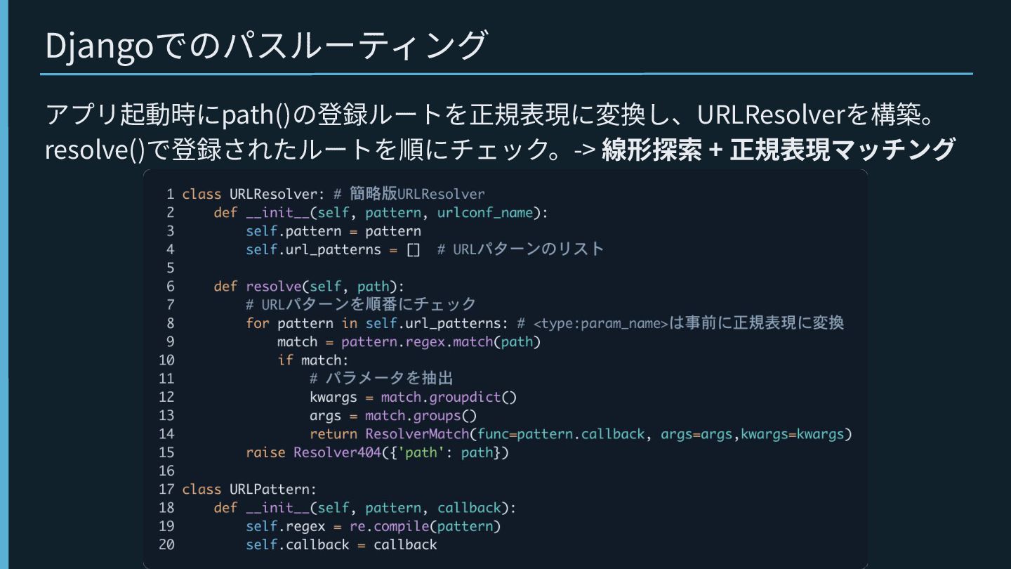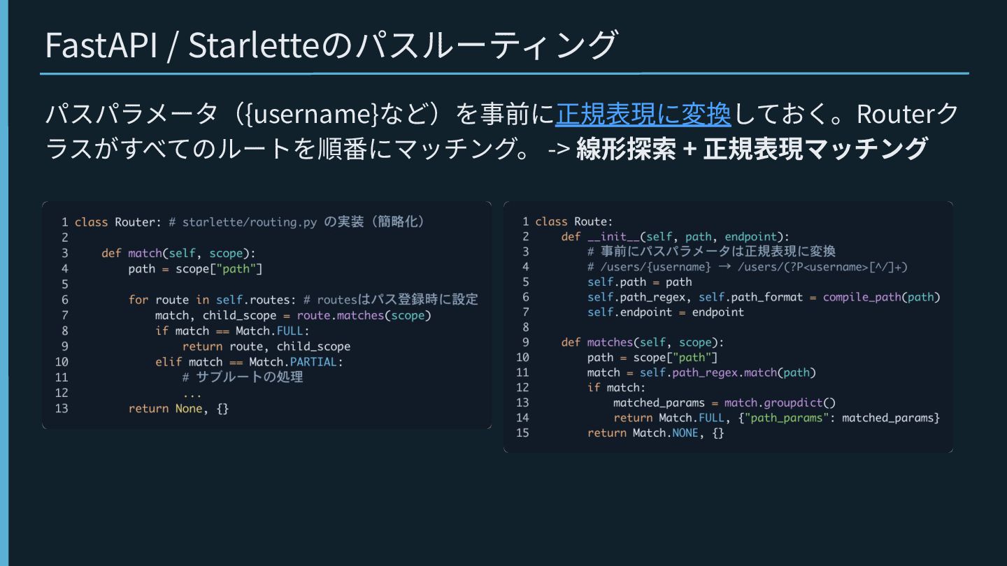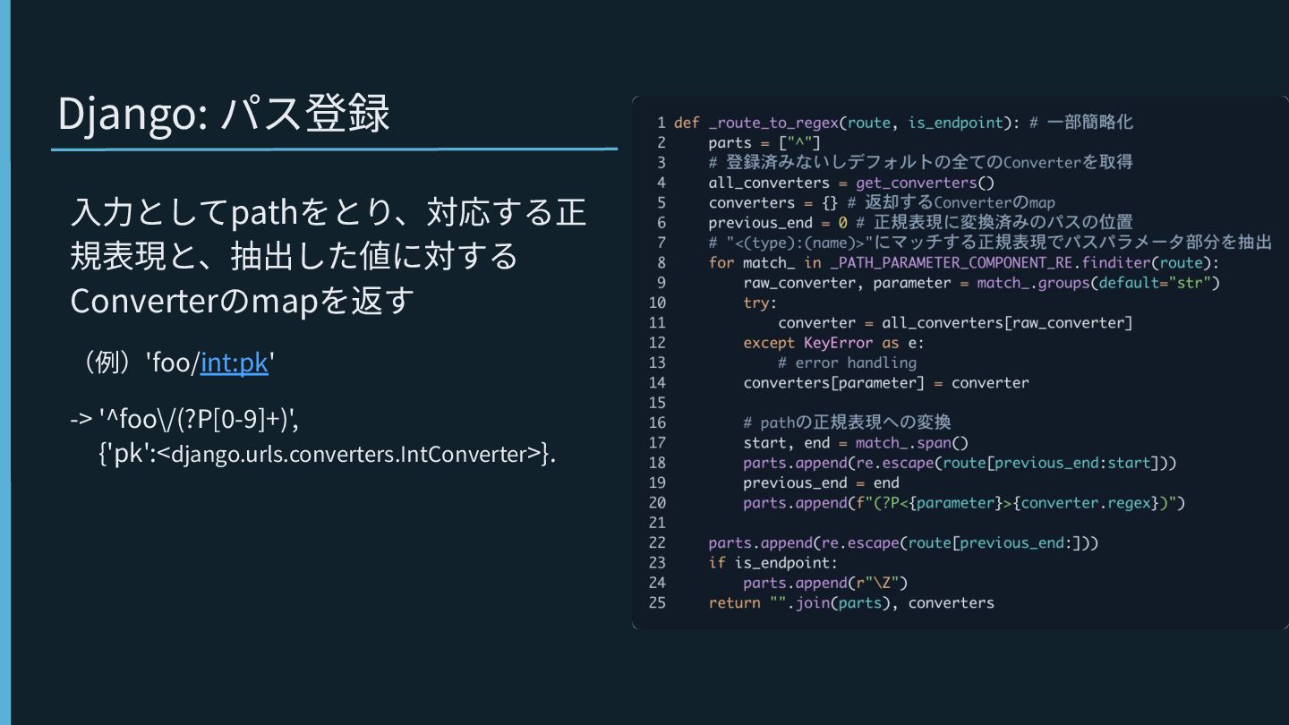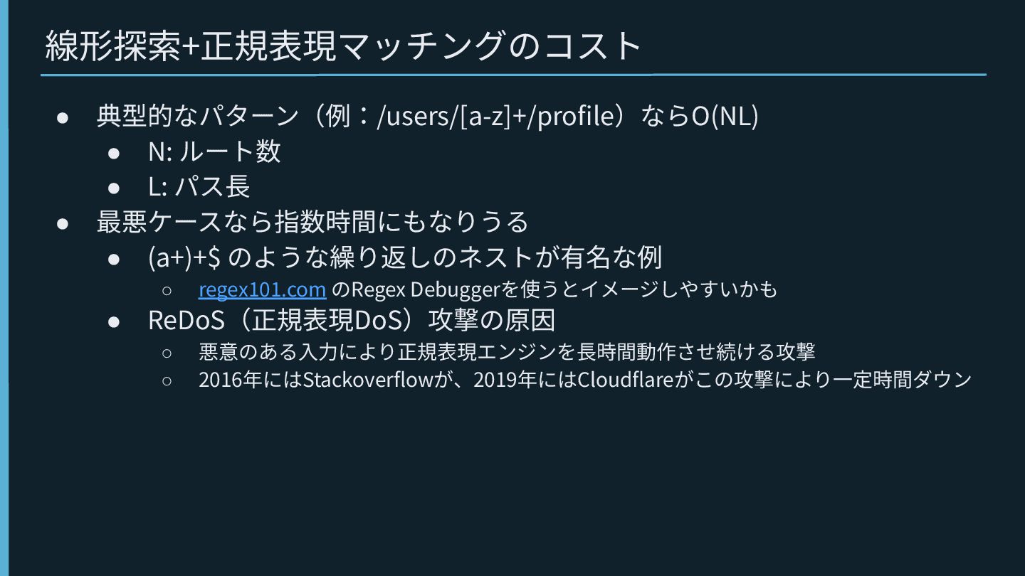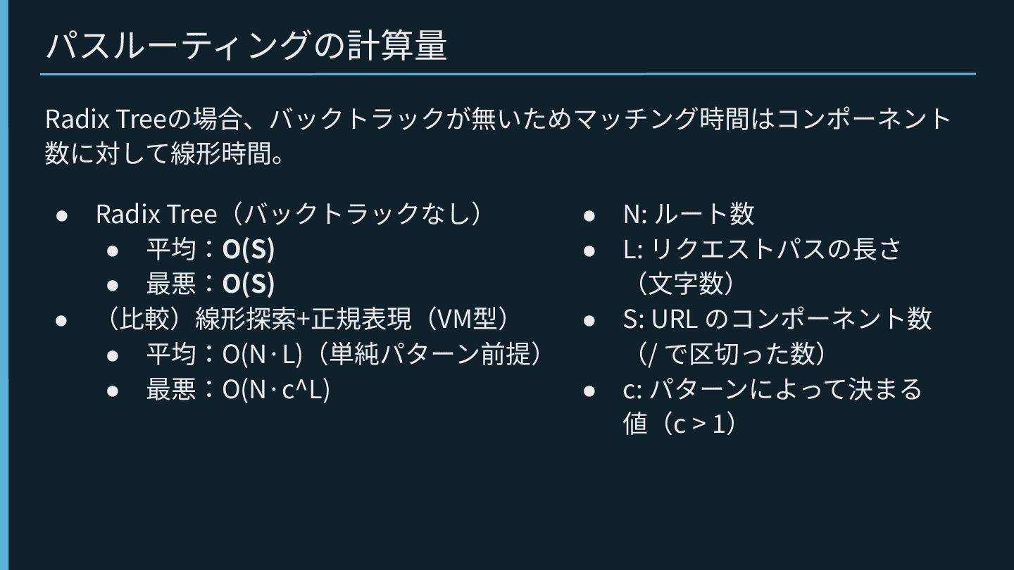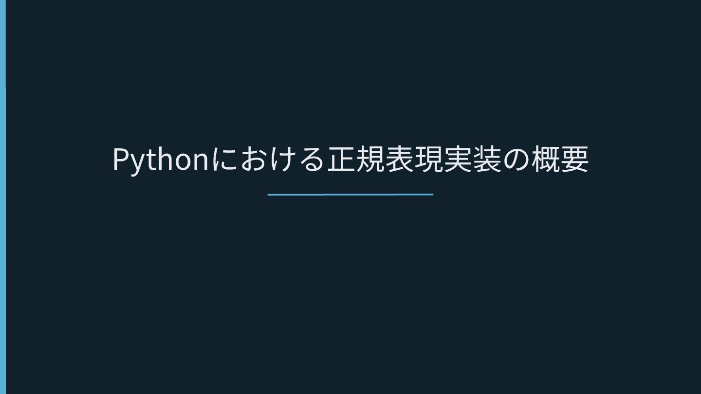 dispatch: switch (*pattern*+) { case SRE_OP_LITERAL: ** 文字比較処理 成功時: goto dispatch */ /*. 失敗時: goto exit */ case SRE_OP_BRANCH: ** 分岐処理 分岐ごとにDO_JUMPする */ /*. 成功時: goto exit */ /*. 失敗時: goto exit */ ** ほか大量の opcode **. */ } exit: ** コンテキストをpopし、一つ前のコンテキストをロード */ goto jumplabel; } #define DO_JUMPX(jumpvalue, jumplabel, nextpattern, toplevel_) \ ** PC, SPの現在の状態を保存 */ \ ** 新しいコンテキストを作りスタックへpush */ \ ** match関数のメインループの先頭へ */ \ goto entrance; \ ** 新しいコンテキストでの評価後ここに戻る */ \ jumplabel: \ ** 保存したPC, SPを復元 */ \ スタックの明示的な管理と goto文により仮 想マシン上での分岐を実現