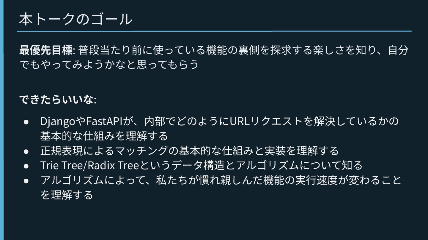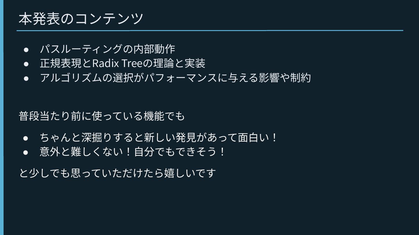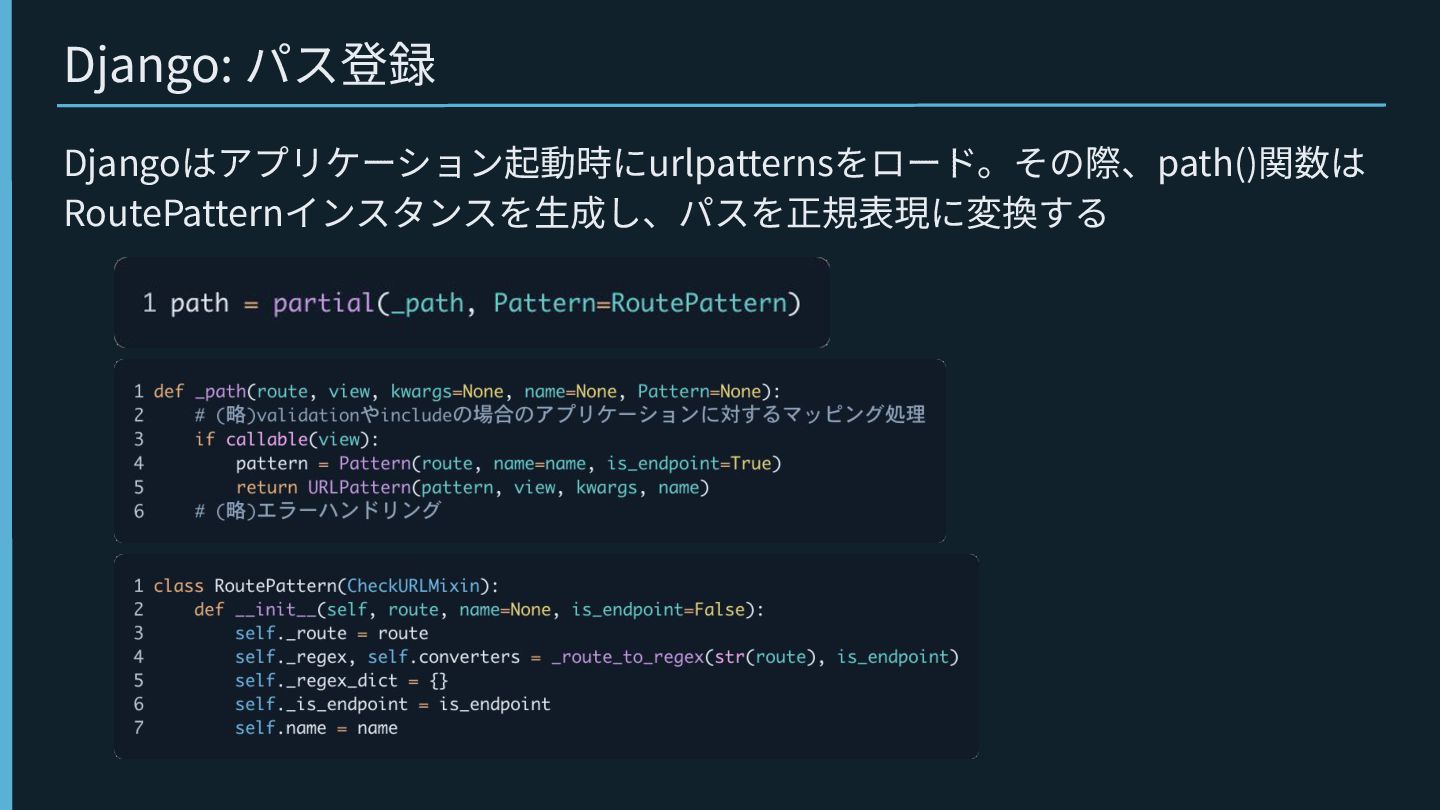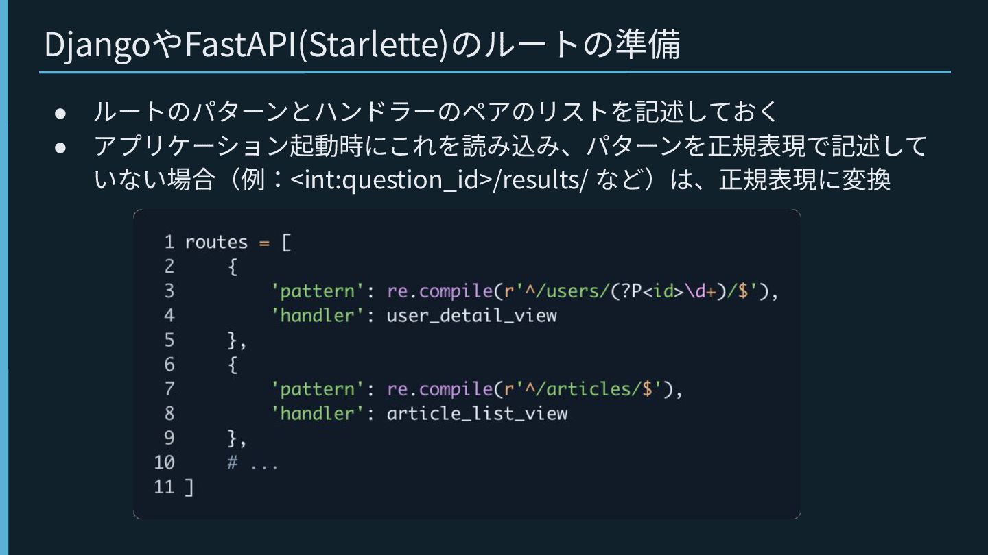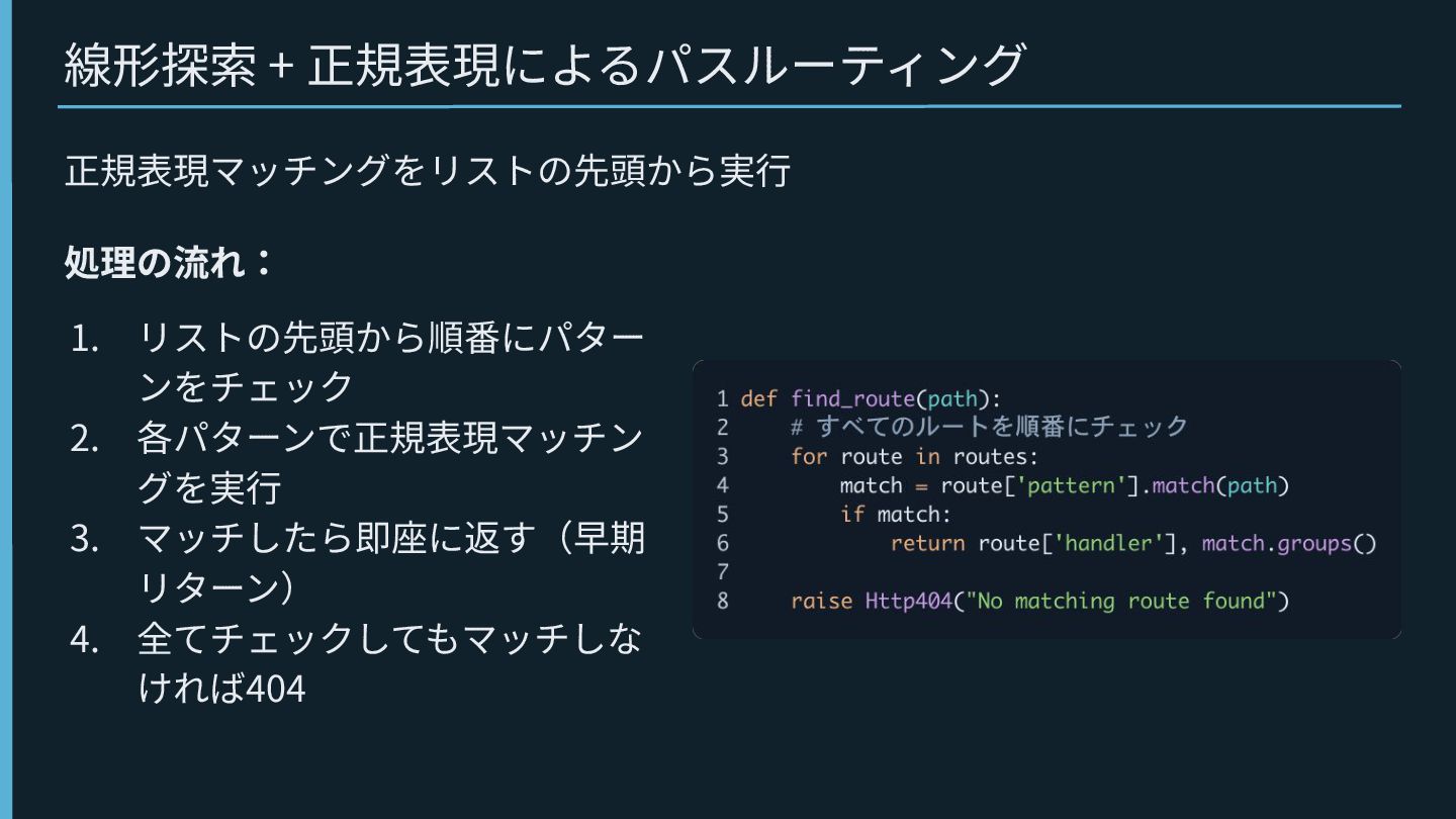 dispatch: switch (*pattern*+) { case SRE_OP_LITERAL: ** 文字比較処理 成功時: goto dispatch */ /*. 失敗時: goto exit */ case SRE_OP_BRANCH: ** 分岐処理 分岐ごとにDO_JUMPする */ /*. 成功時: goto exit */ /*. 失敗時: goto exit */ ** ほか大量の opcode **. */ } exit: ** コンテキストをpopし、一つ前のコンテキストをロード */ goto jumplabel; } #define DO_JUMPX(jumpvalue, jumplabel, nextpattern, toplevel_) \ ** PC, SPの現在の状態を保存 */ \ ** 新しいコンテキストを作りスタックへpush */ \ ** match関数のメインループの先頭へ */ \ goto entrance; \ ** 新しいコンテキストでの評価後ここに戻る */ \ jumplabel: \ ** 保存したPC, SPを復元 */ \ スタックの明示的な管理と goto文により仮 想マシン上での分岐を実現