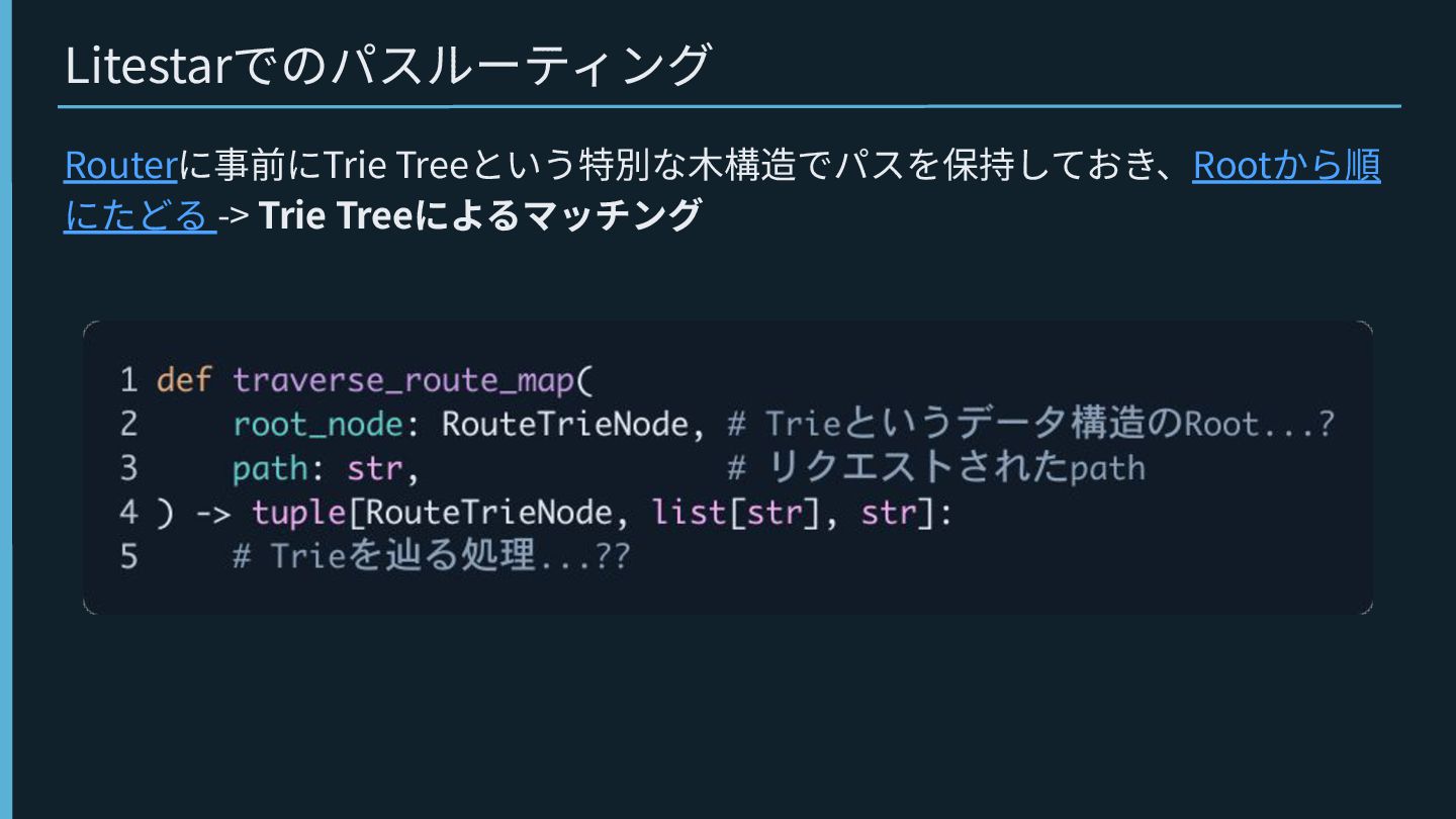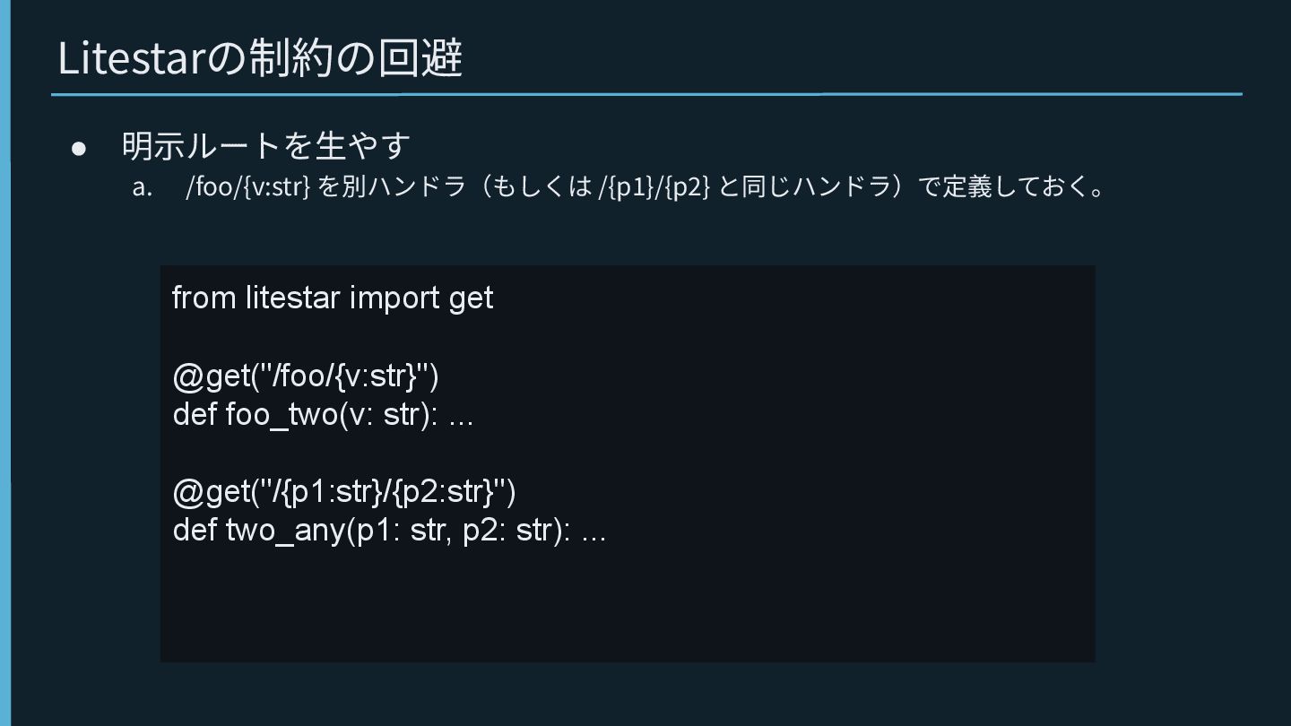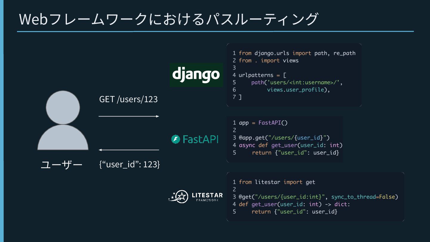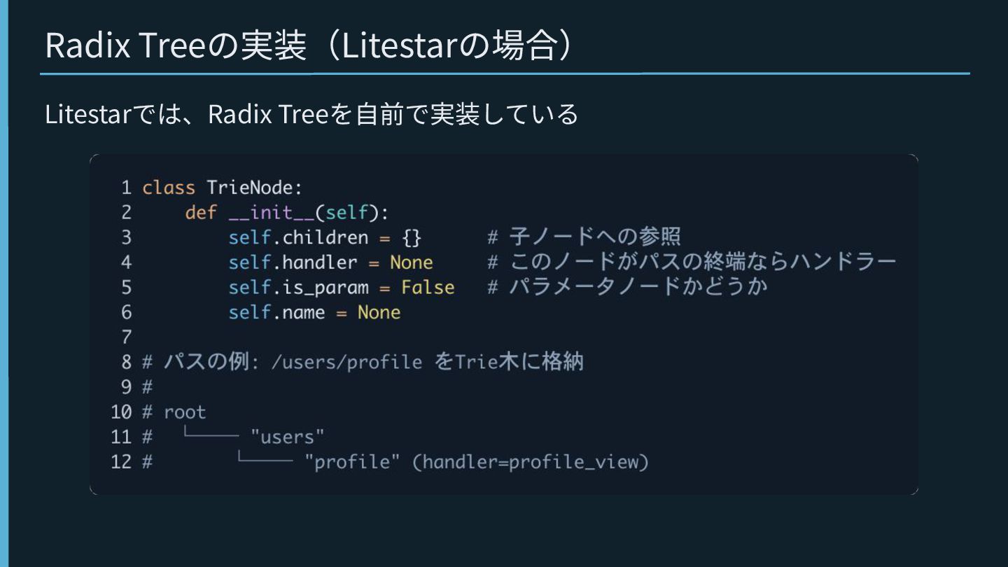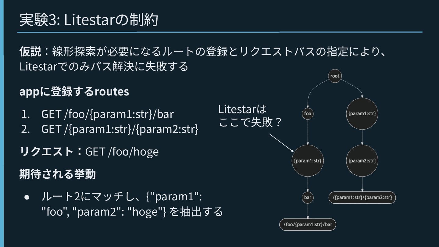 dispatch: switch (*pattern*+) { case SRE_OP_LITERAL: ** 文字比較処理 成功時: goto dispatch */ /*. 失敗時: goto exit */ case SRE_OP_BRANCH: ** 分岐処理 分岐ごとにDO_JUMPする */ /*. 成功時: goto exit */ /*. 失敗時: goto exit */ ** ほか大量の opcode **. */ } exit: ** コンテキストをpopし、一つ前のコンテキストをロード */ goto jumplabel; } #define DO_JUMPX(jumpvalue, jumplabel, nextpattern, toplevel_) \ ** PC, SPの現在の状態を保存 */ \ ** 新しいコンテキストを作りスタックへpush */ \ ** match関数のメインループの先頭へ */ \ goto entrance; \ ** 新しいコンテキストでの評価後ここに戻る */ \ jumplabel: \ ** 保存したPC, SPを復元 */ \ スタックの明示的な管理と goto文により仮 想マシン上での分岐を実現