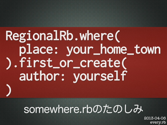 RegionalRb.where( place: your_home_town ).first_or_create( author: yourself ) 2013-04-06 every.rb TPNFXIFSFSCͷͨͷ͠Έ
