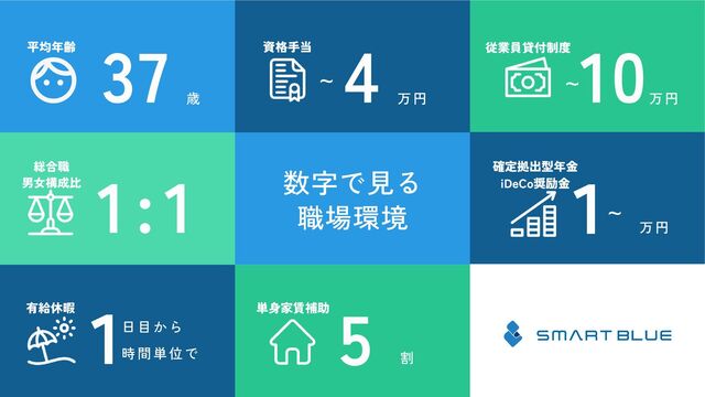 : 1 総合職 男女構成比 37 平均年齢 歳 4 資格手当 万円 ~ 1 確定拠出型年金 iDeCo奨励金 万円 ~ 従業員貸付制度 10 万円 ~