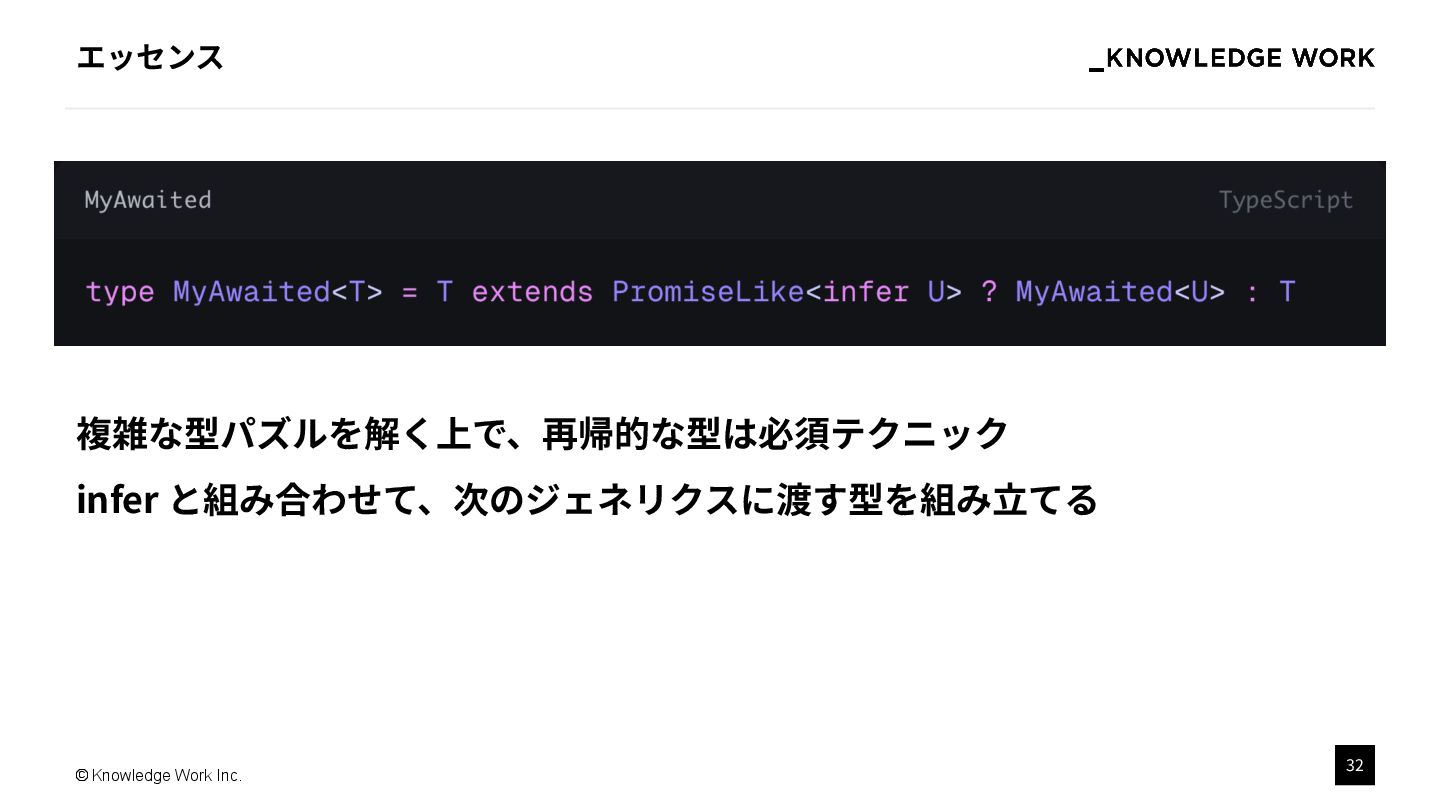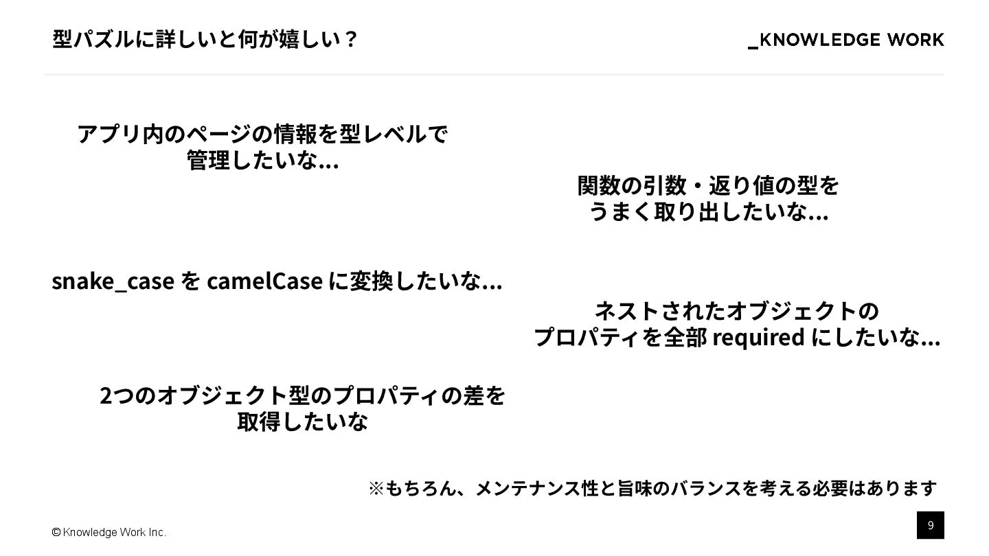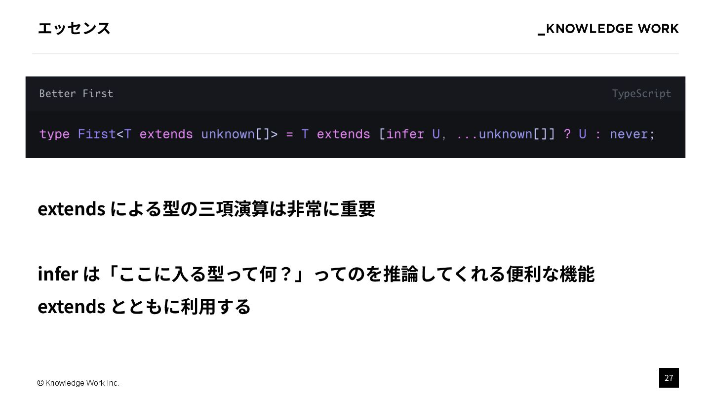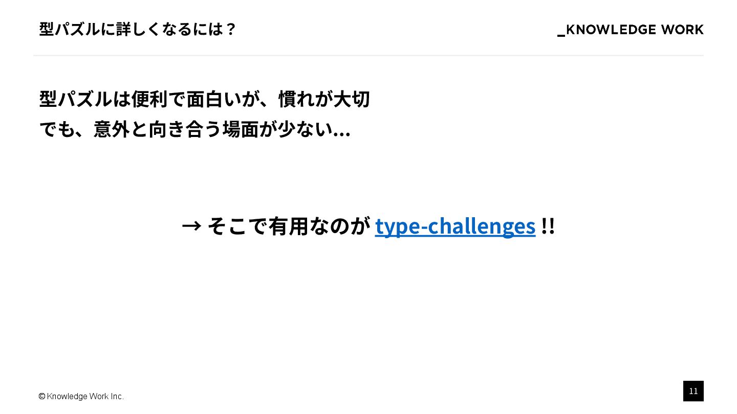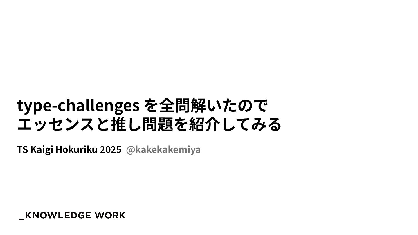 そこで本セッションでは、type-challenges の全問題に取り組んだ自分が、解く中で学んだ型パズルのテクニックや、実務に活かせそうな部分などを「エッセンス」として紹介します。