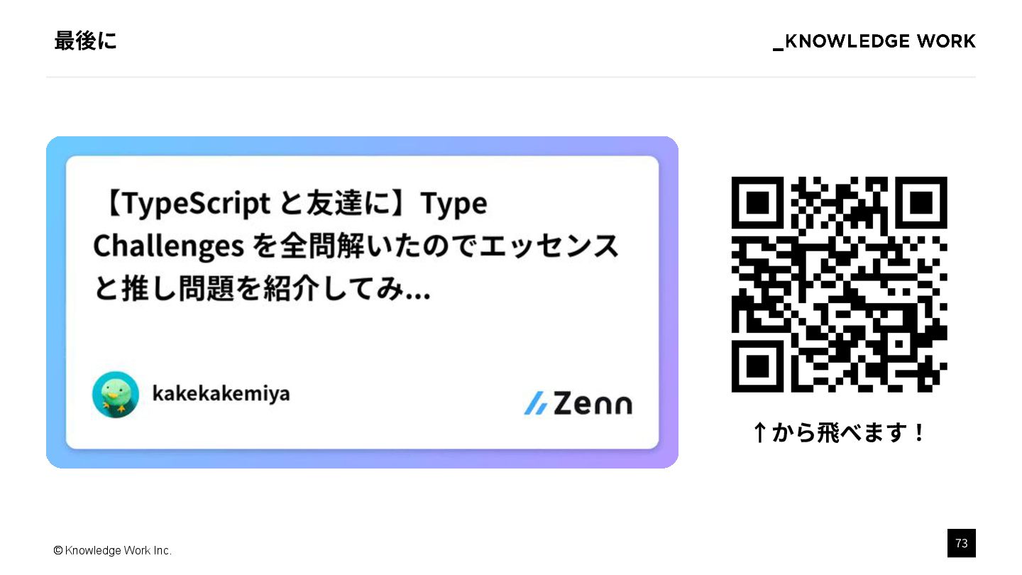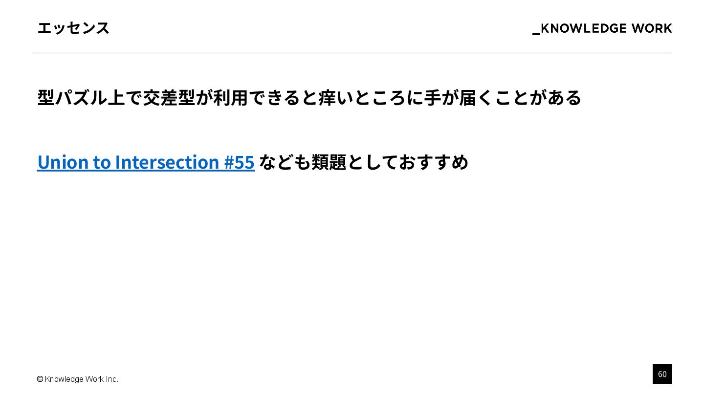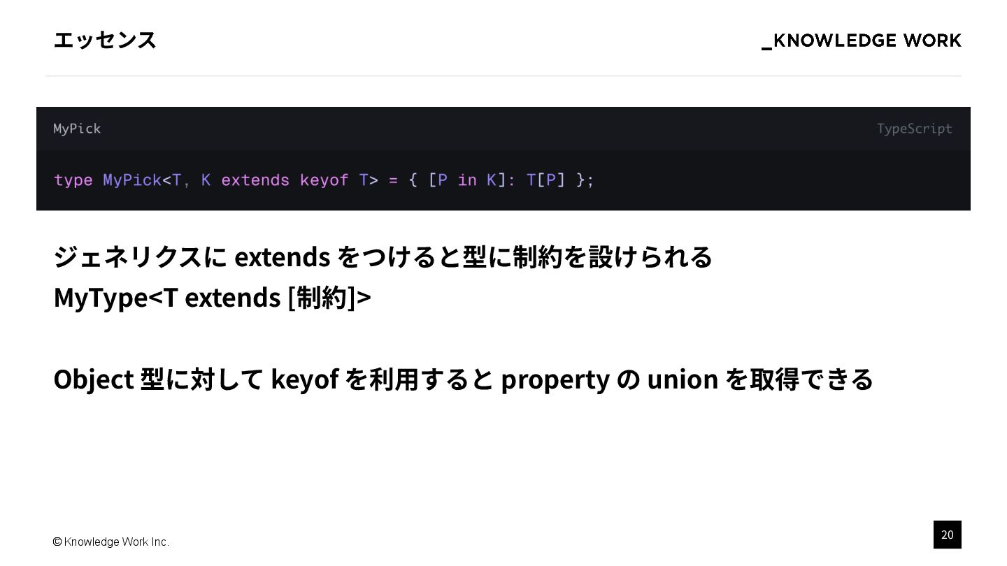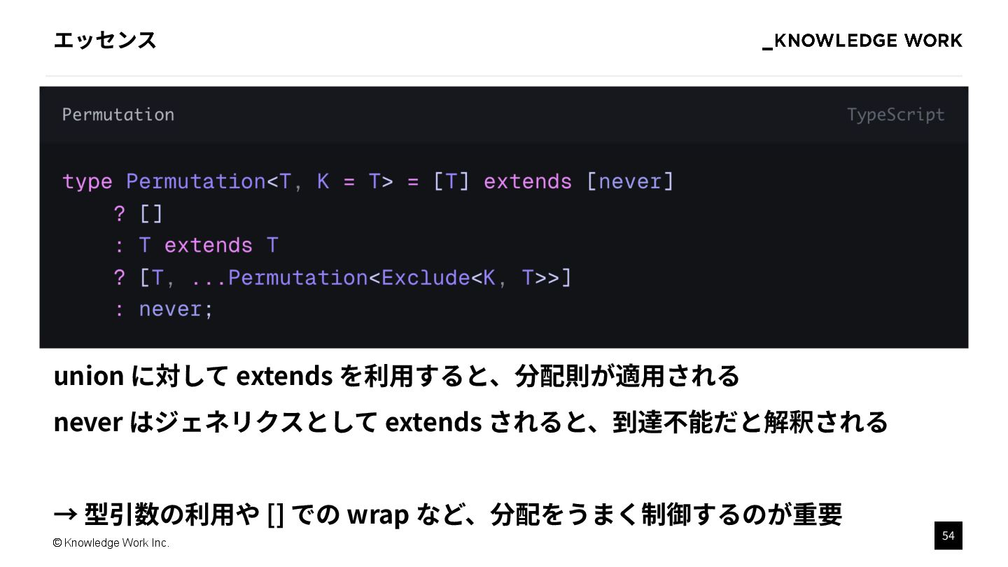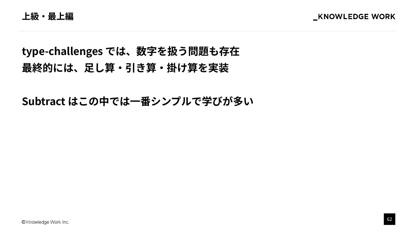 そこで本セッションでは、type-challenges の全問題に取り組んだ自分が、解く中で学んだ型パズルのテクニックや、実務に活かせそうな部分などを「エッセンス」として紹介します。