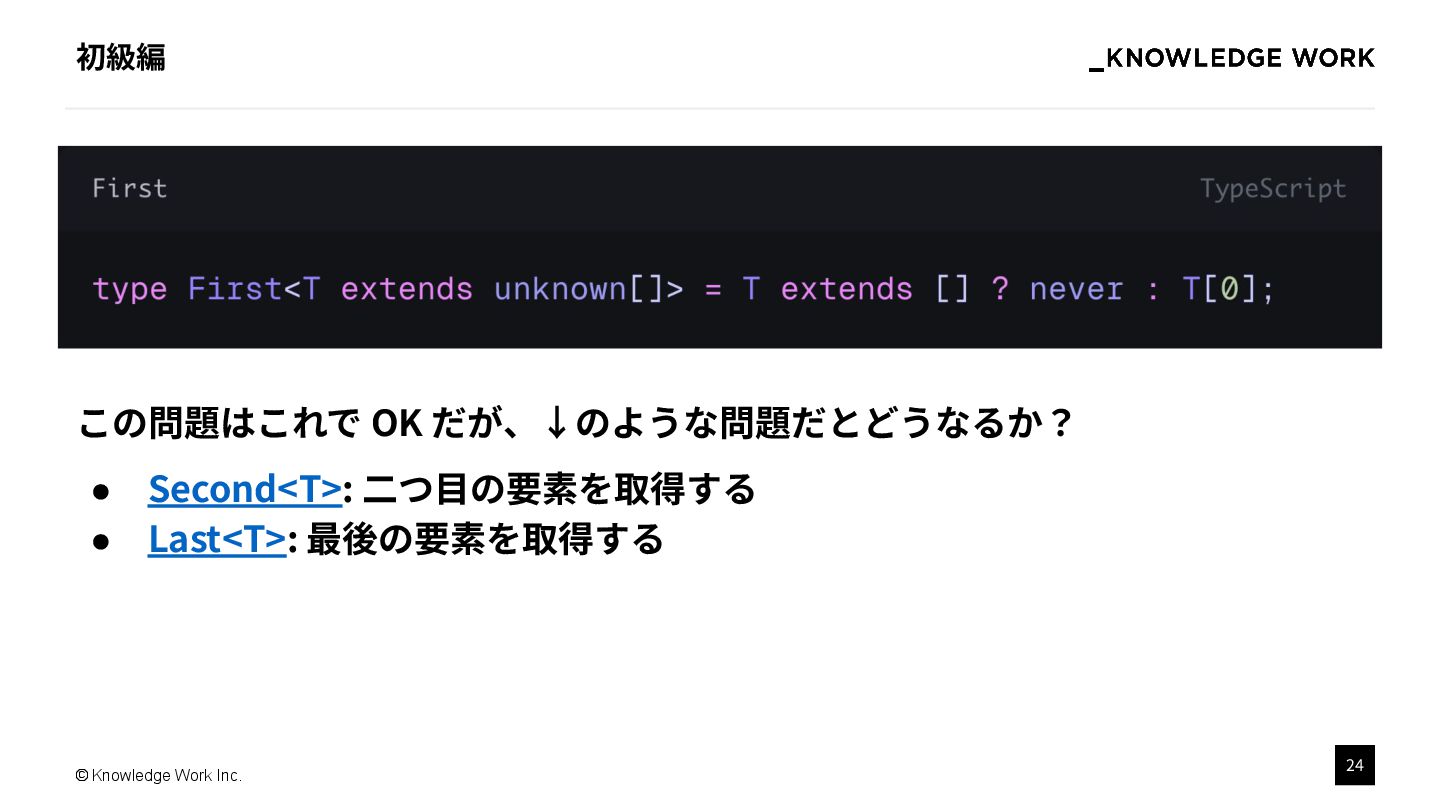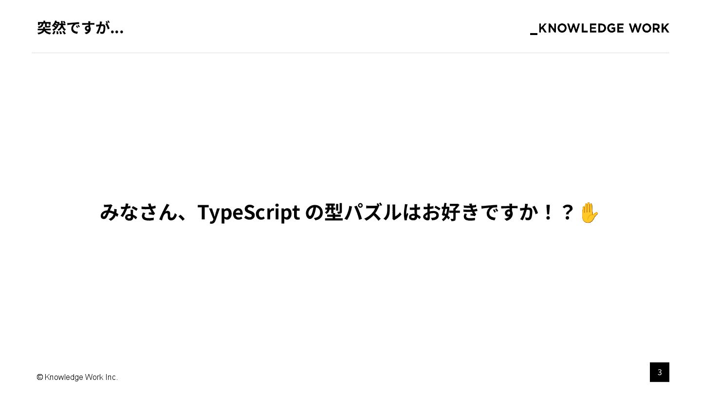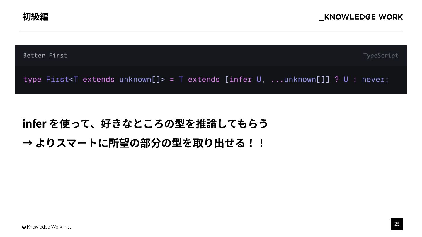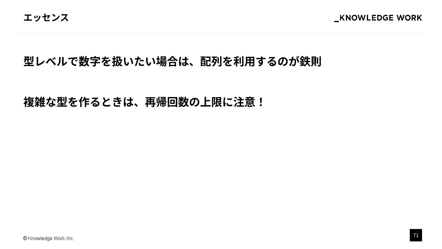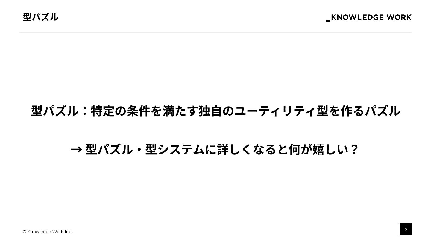 そこで本セッションでは、type-challenges の全問題に取り組んだ自分が、解く中で学んだ型パズルのテクニックや、実務に活かせそうな部分などを「エッセンス」として紹介します。