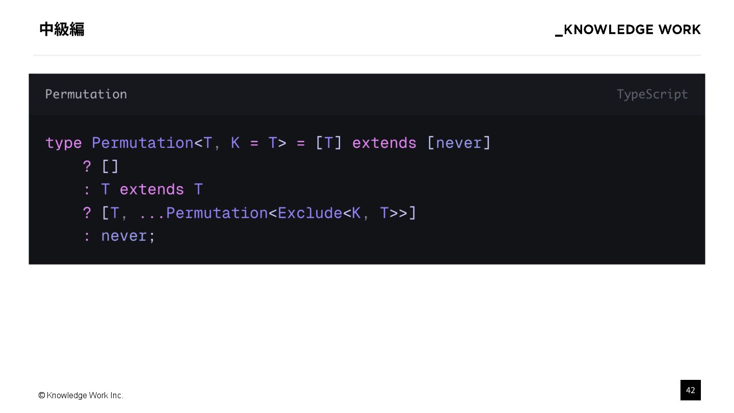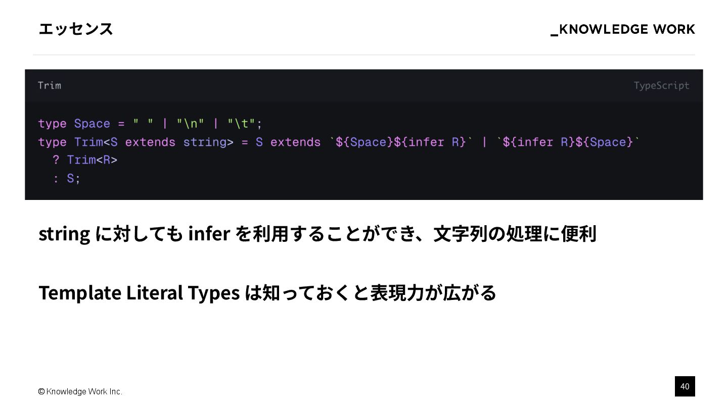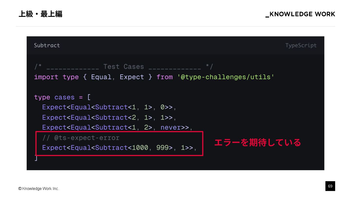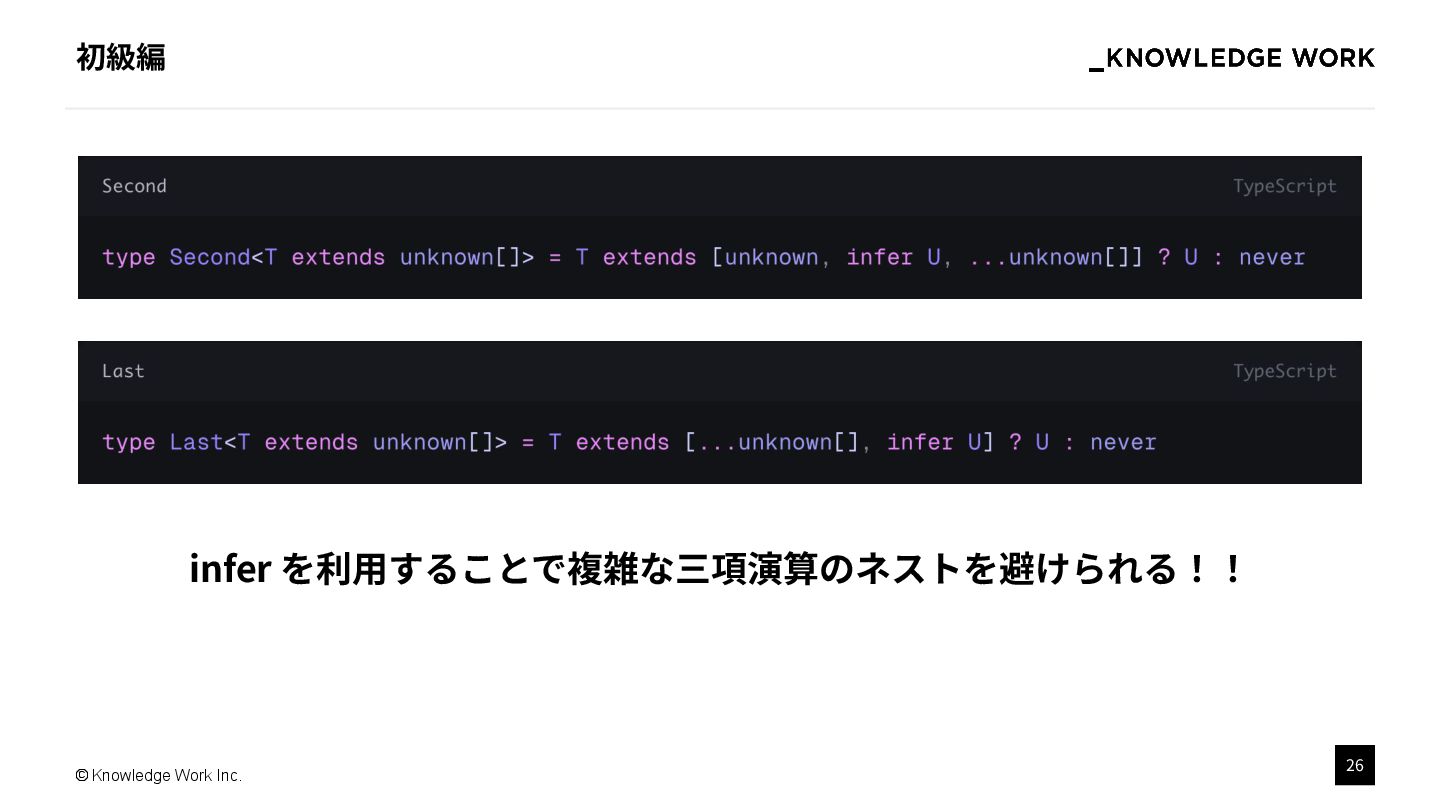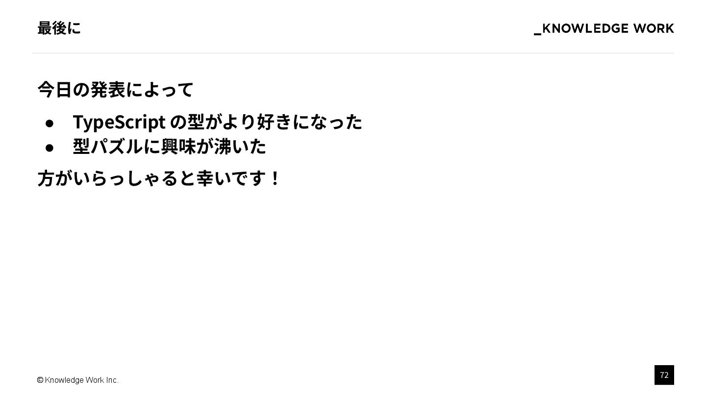 そこで本セッションでは、type-challenges の全問題に取り組んだ自分が、解く中で学んだ型パズルのテクニックや、実務に活かせそうな部分などを「エッセンス」として紹介します。