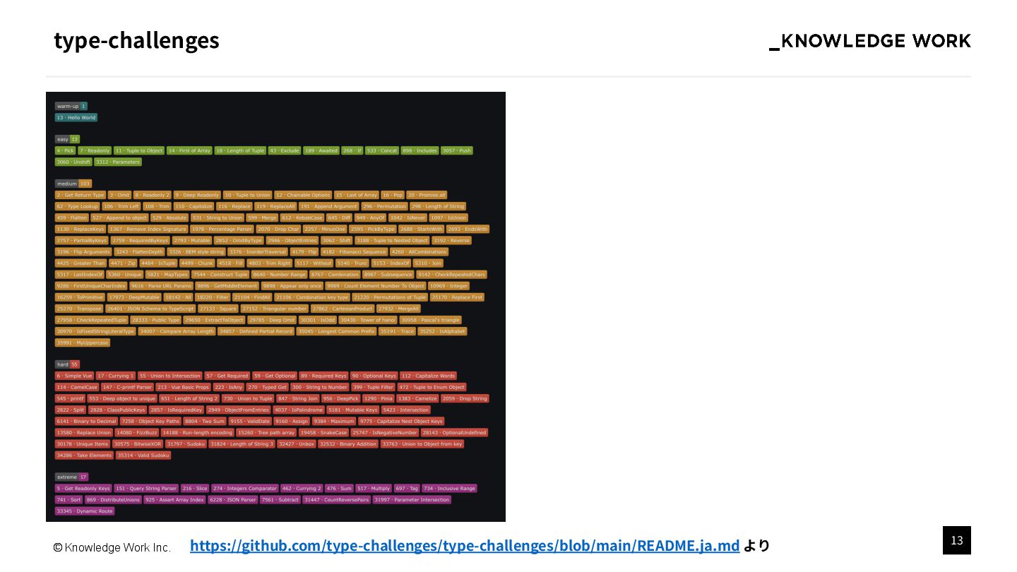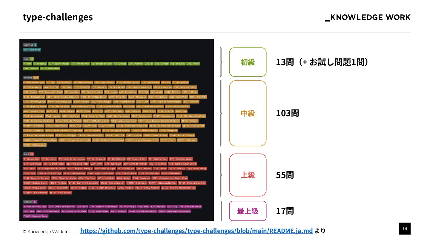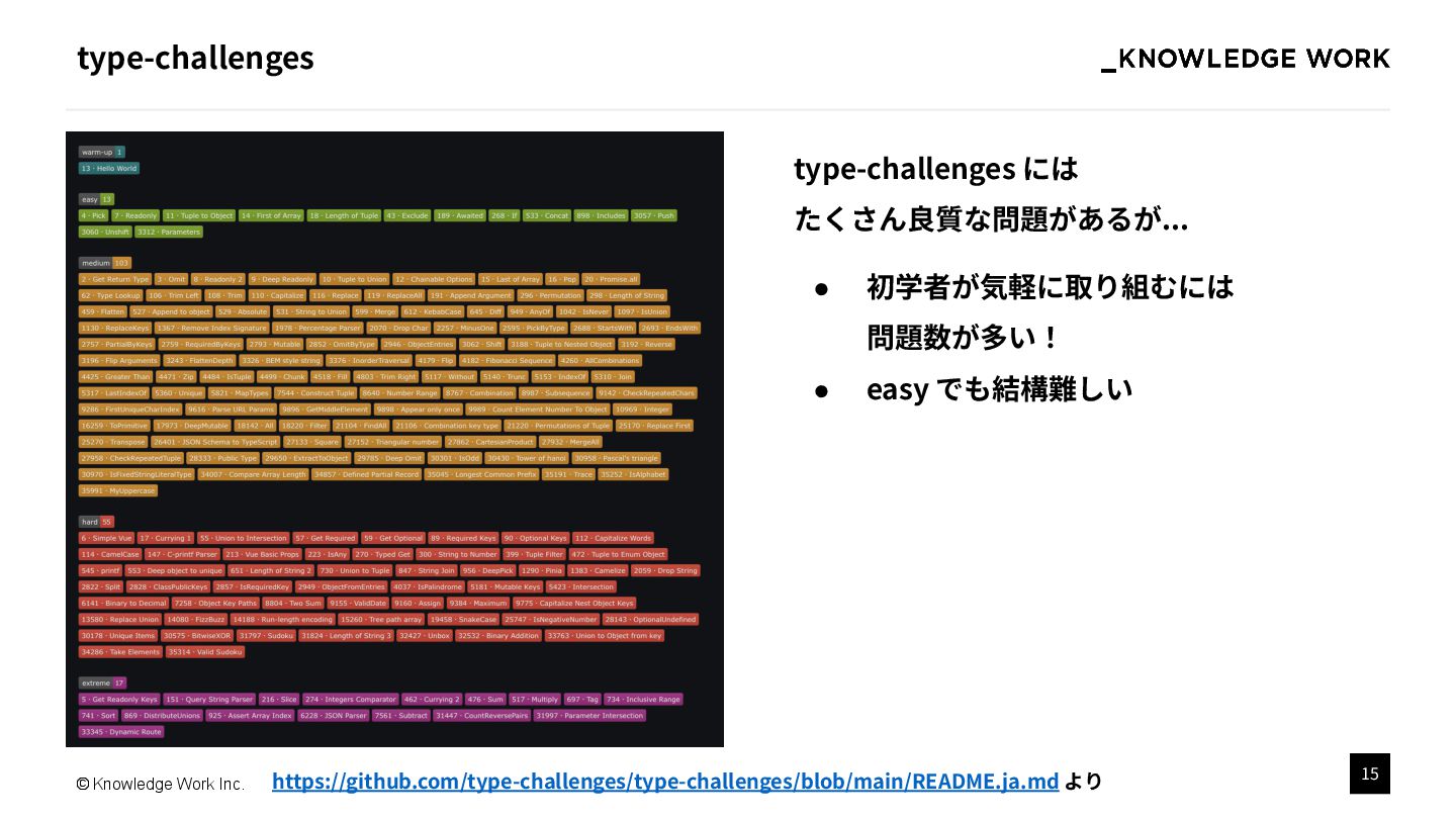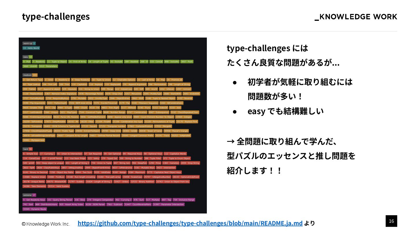 TypeScript の型への理解・型パズル力を高めるために、type-challenges は非常に有用な教材ですが、「問題数が結構多い」「なんだか難しそう」と、食わず嫌いをされがちである印象があります。