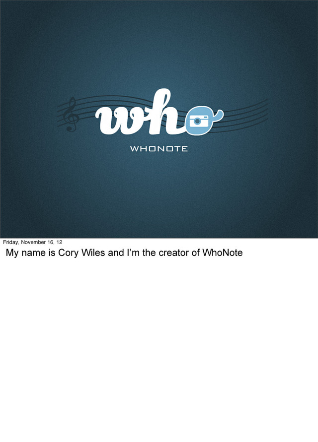 me” Esthero Friday, November 16, 12 Almost every significant moment in our lives has a song associated with it. For example * your daughter’s dance recital * the last first kiss you ever had Pull out your phone right now and look at your photos. They all captured moments that have meaning. but how do we link these memories and music beyond simple reminiscing? I have this need. My friends and family have this need. So I figured I'd take a crack at it. WhoNote is the product