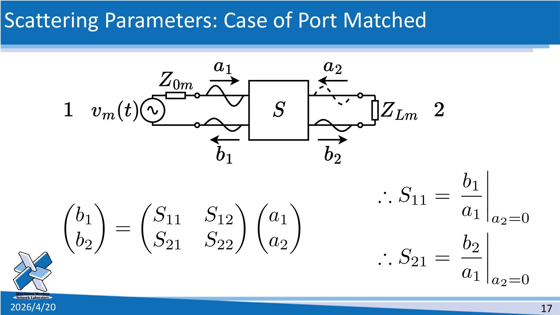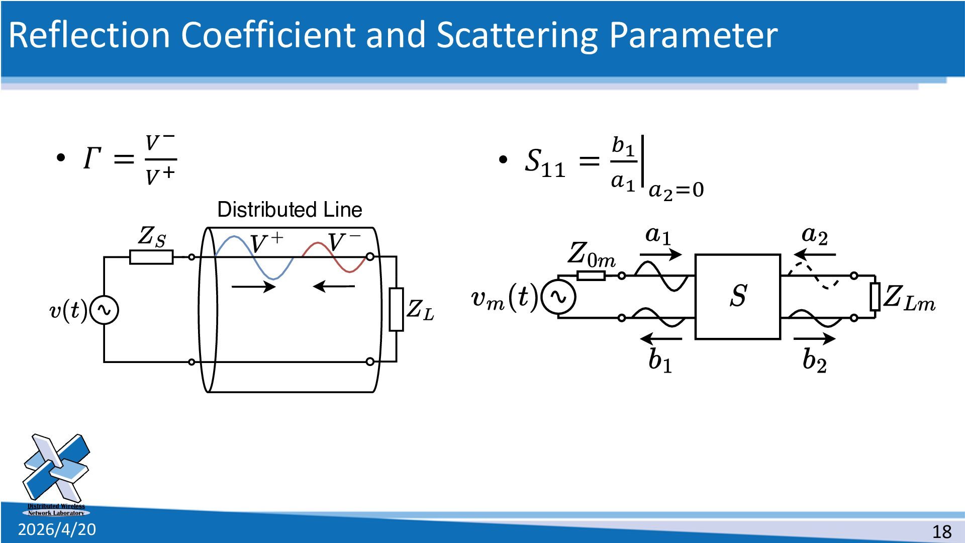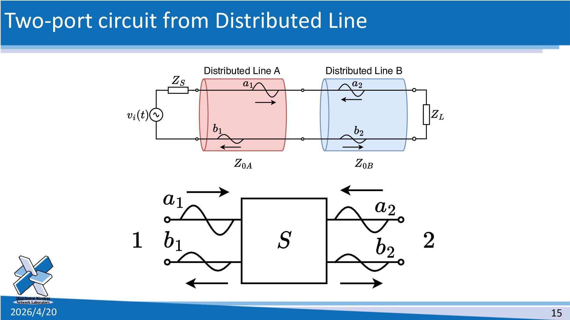 line • The definition of the scattering parameters for a two-port circuit 1. Solve the telegram equations 2. Connect two distributed lines as a two-port circuit 3. Suppose a special situation 4