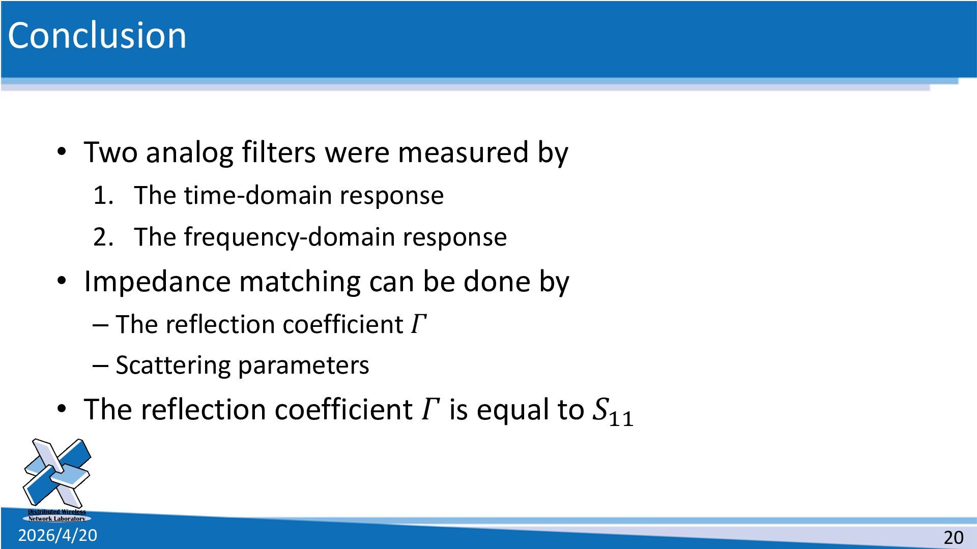 The time-domain response 2. The frequency-domain response • Impedance matching can be done by – The reflection coefficient 𝛤 – Scattering parameters • The reflection coefficient 𝛤 is equal to 𝑆$$ 20