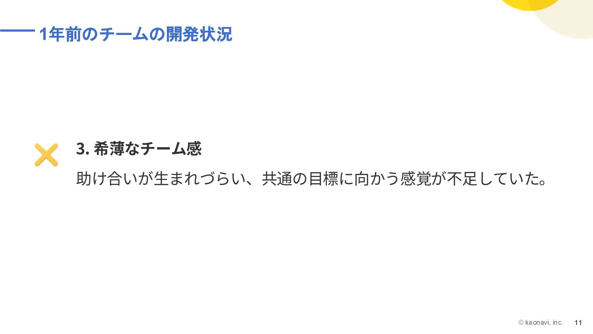 1年前のチームの開発状況 © kaonavi, inc. 11 3. 希薄なチーム感 助け合いが生まれづらい、共通の目標に向かう感覚が不足していた。