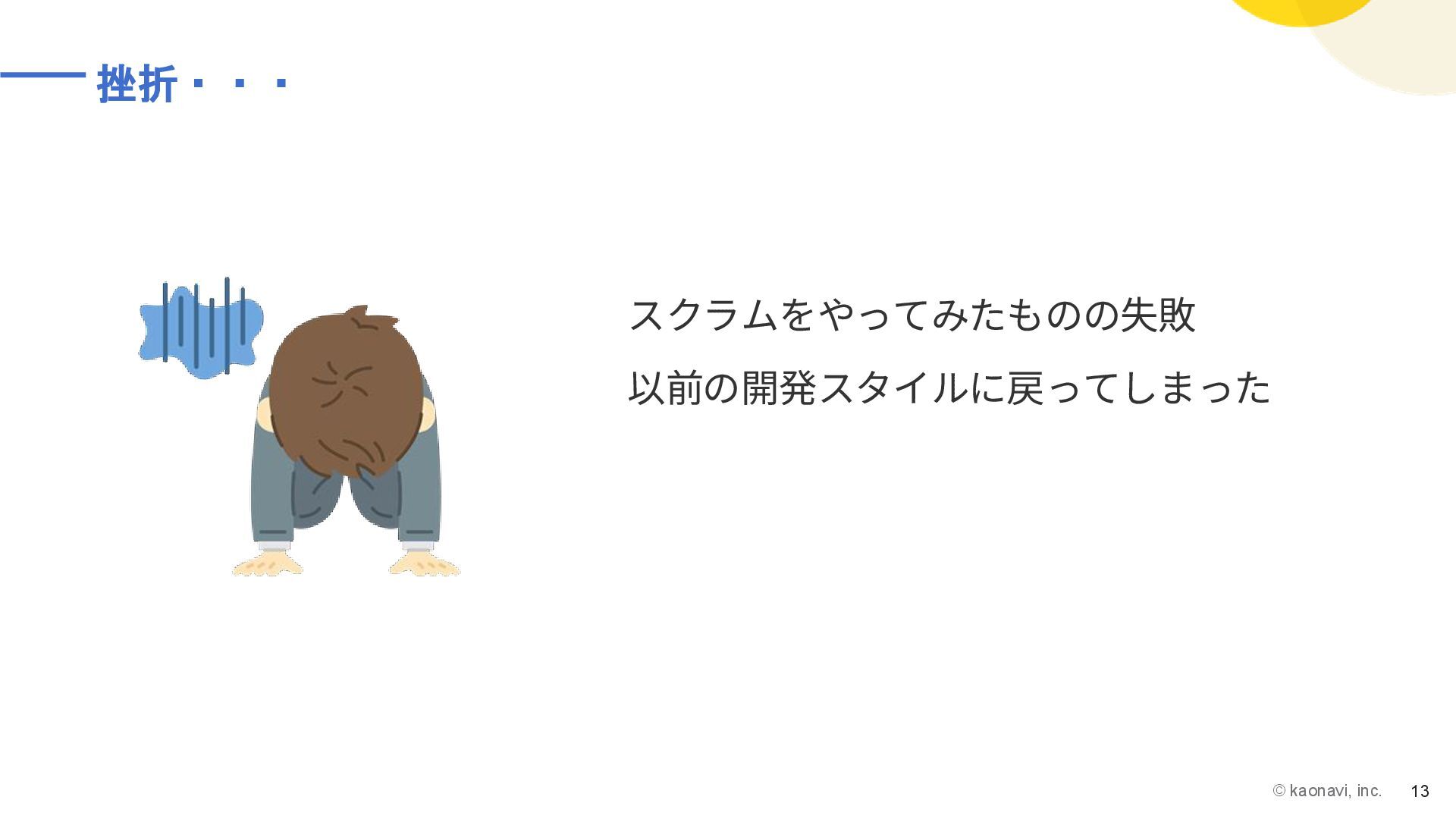 挫折・・・ © kaonavi, inc. 13 スクラムをやってみたものの失敗 以前の開発スタイルに戻ってしまった