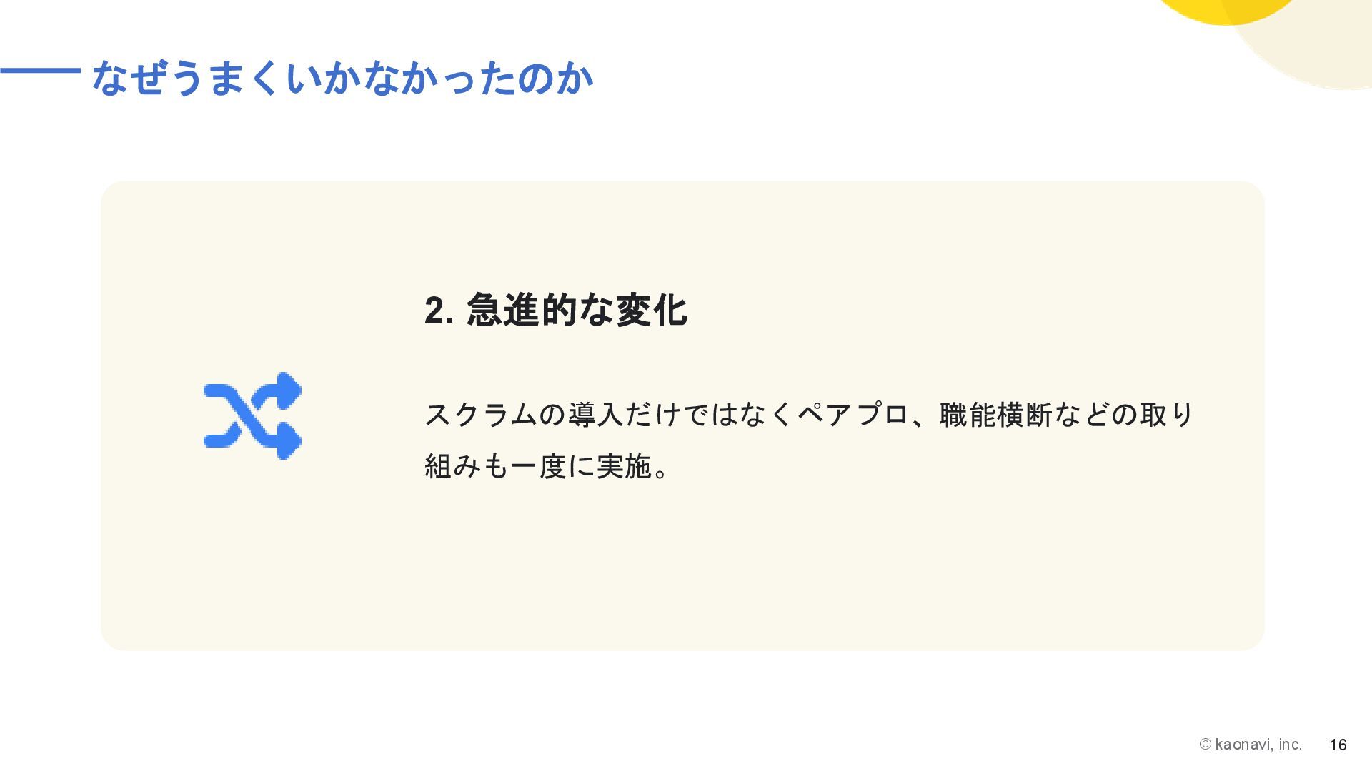 なぜうまくいかなかったのか スクラムの導入だけではなくペアプロ、職能横断などの取り 組みも一度に実施。 2. 急進的な変化 © kaonavi, inc. 16