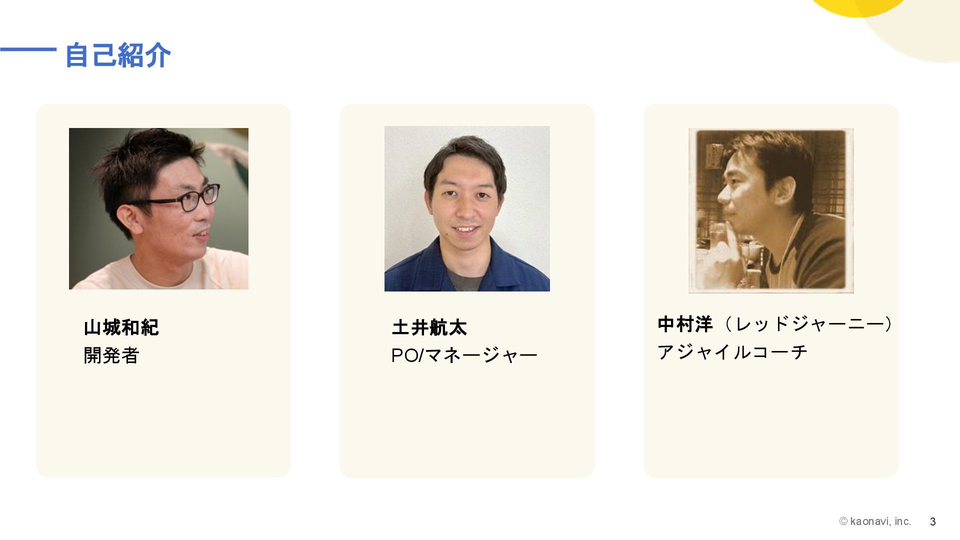 自己紹介 © kaonavi, inc. 3 土井航太 PO/マネージャー 山城和紀 開発者 中村洋(レッドジャーニー)