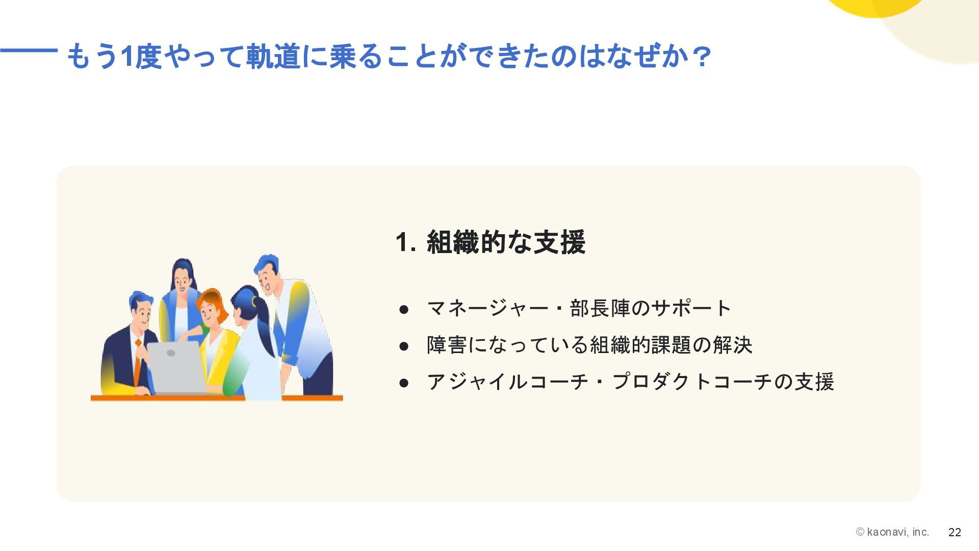 もう1度やって軌道に乗ることができたのはなぜか? • マネージャー・部長陣のサポート • 障害になっている組織的課題の解決 • アジャイルコーチ・プロダクトコーチの支援 1. 組織的な支援 ©