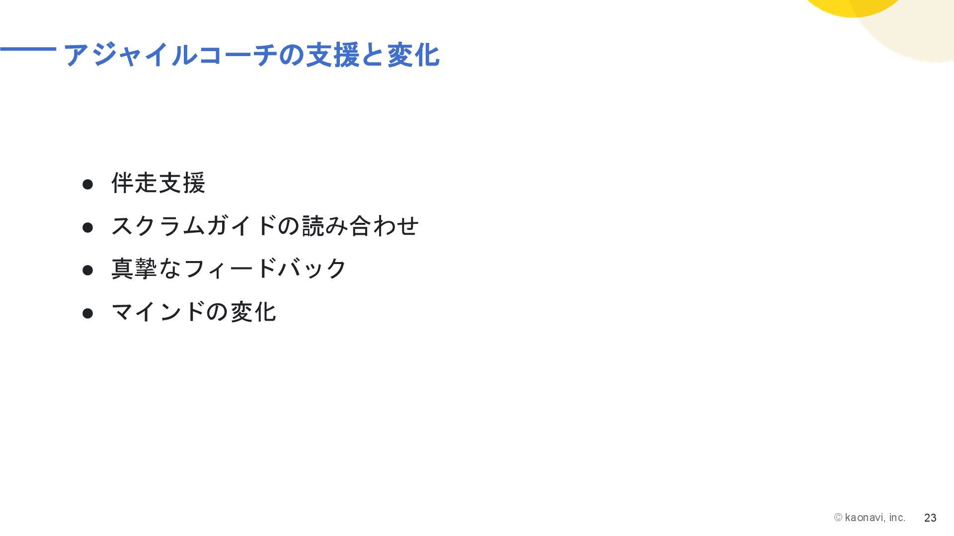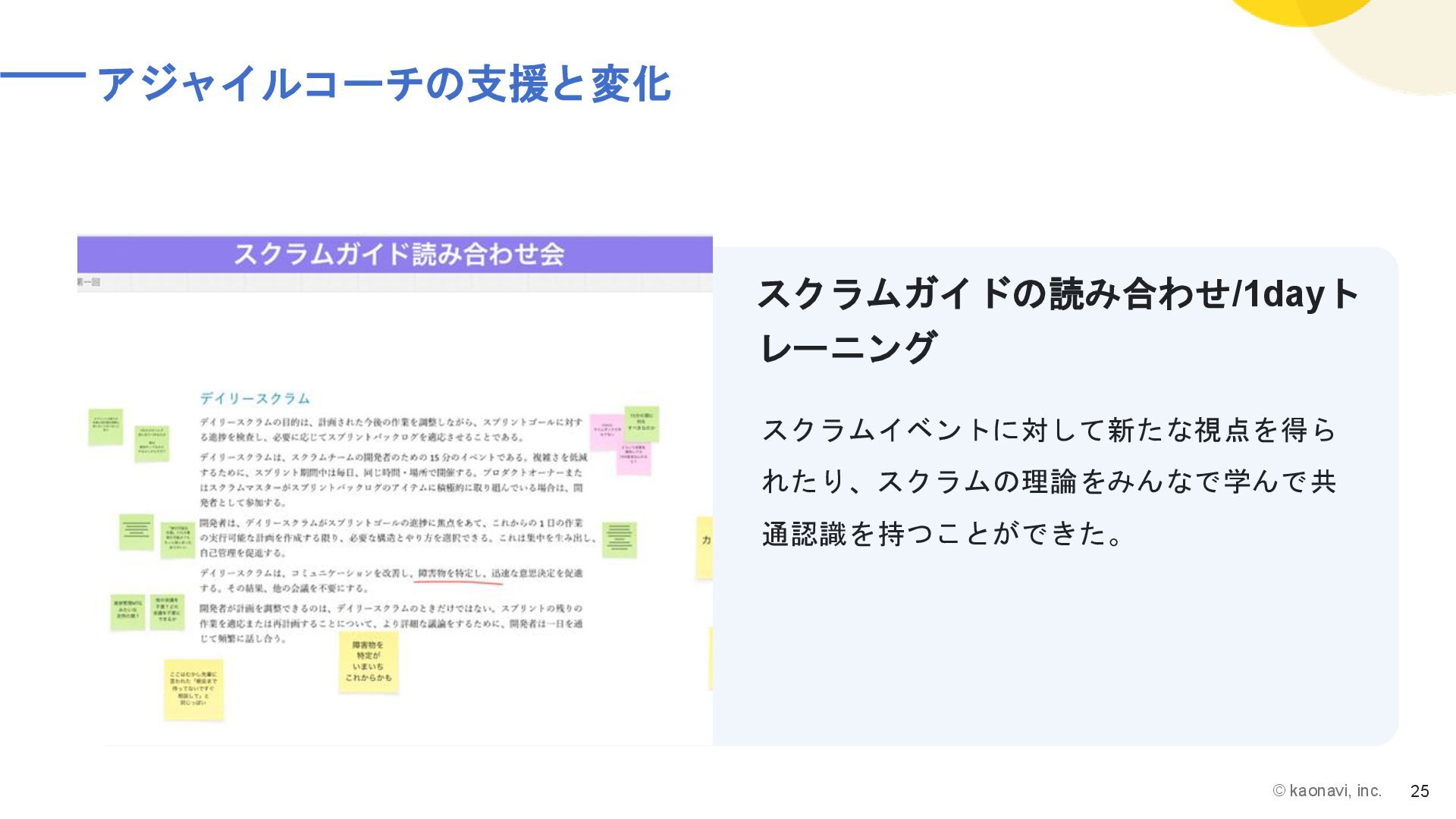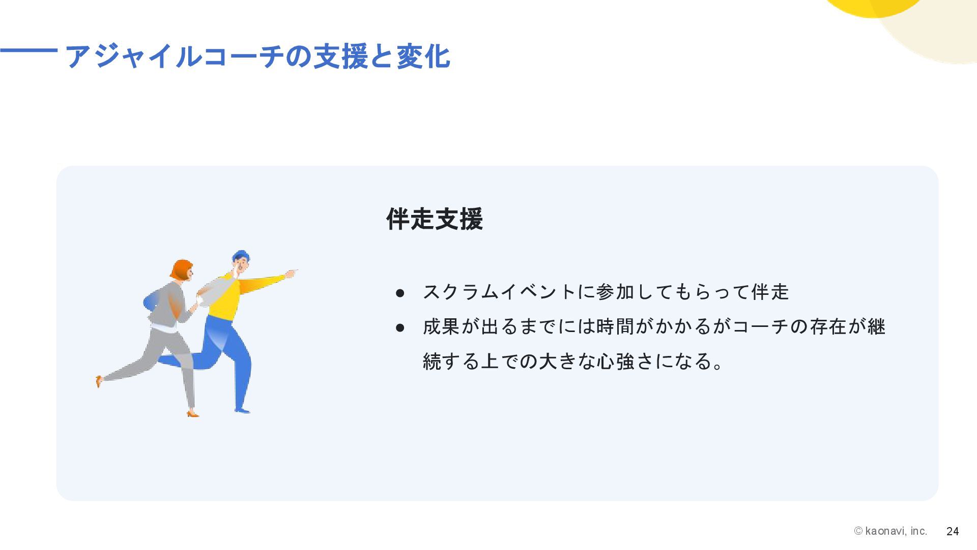 アジャイルコーチの支援と変化 © kaonavi, inc. 23 • 伴走支援 • スクラムガイドの読み合わせ •