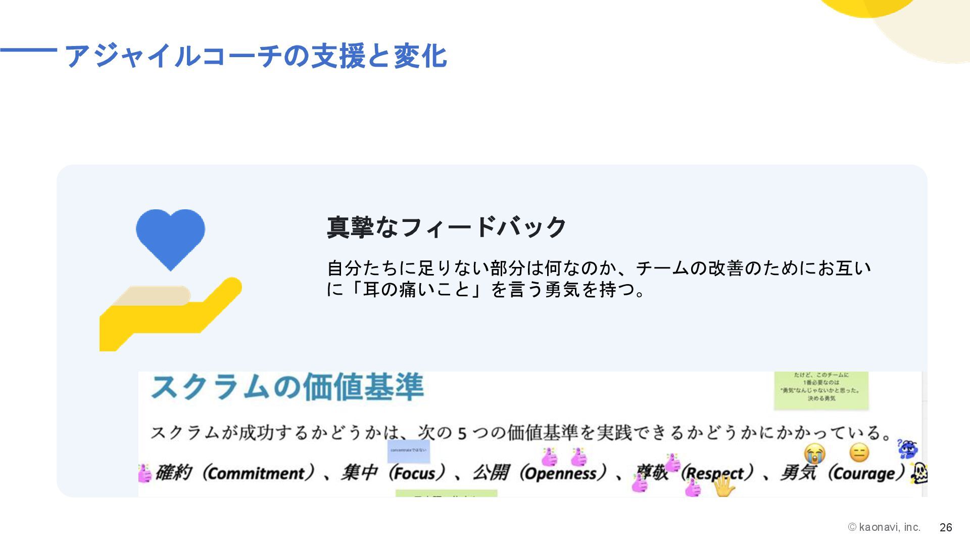 アジャイルコーチの支援と変化 自分たちに足りない部分は何なのか、チームの改善のためにお互い に「耳の痛いこと」を言う勇気を持つ。 真摯なフィードバック © kaonavi, inc. 26