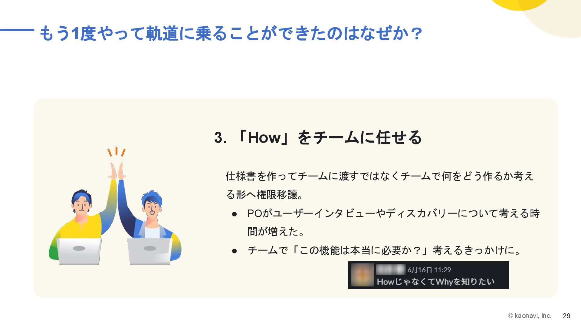 もう1度やって軌道に乗ることができたのはなぜか? 仕様書を作ってチームに渡すではなくチームで何をどう作るか考え る形へ権限移譲。 • POがユーザーインタビューやディスカバリーについて考える時 間が増えた。 • チームで「この機能は本当に必要か?」考えるきっかけに。 3. 「How」をチームに任せる