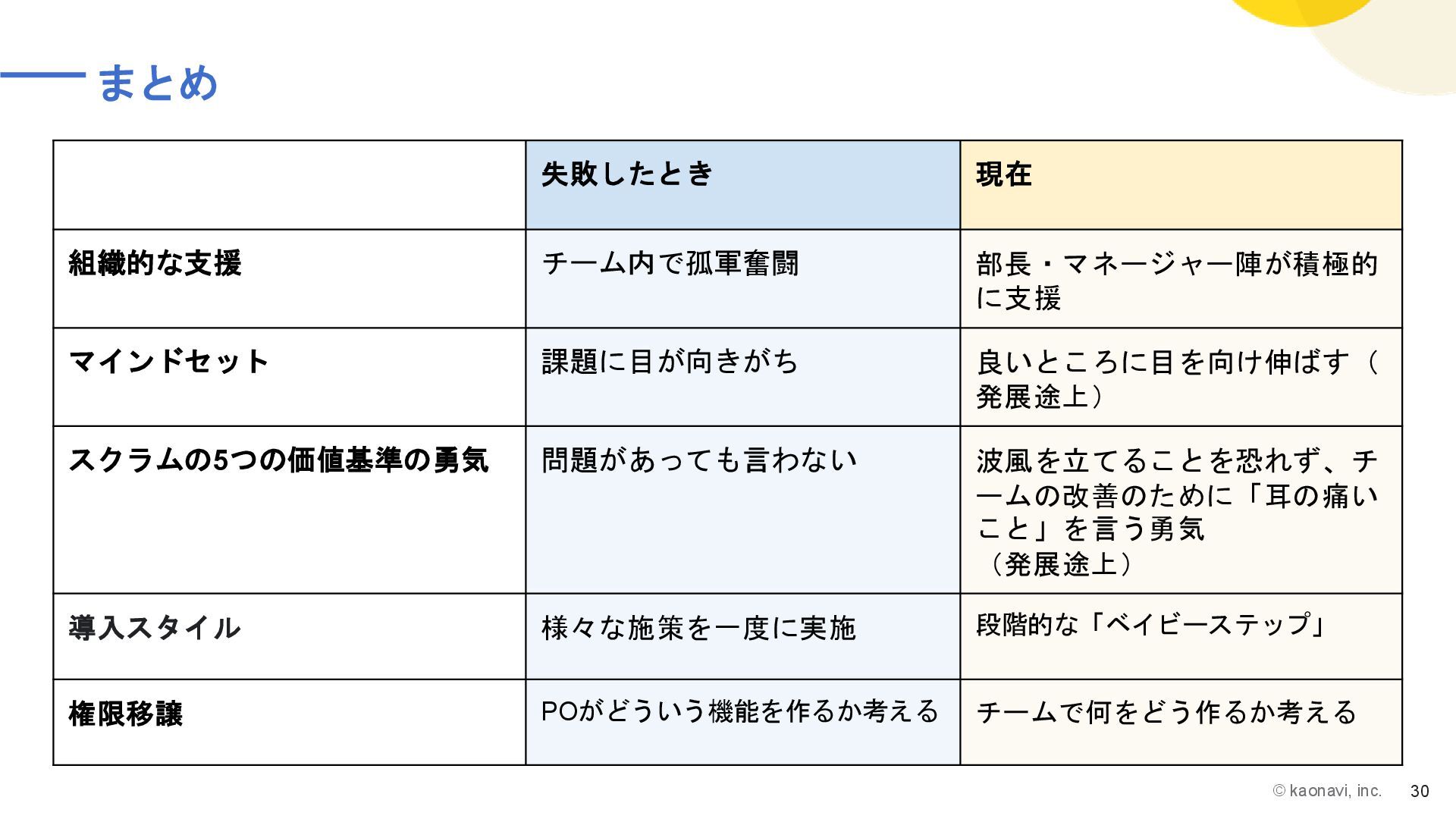 もう1度やって軌道に乗ることができたのはなぜか? 一度にすべてを変えるのではなくステップを区切って少しづつで きることを増やした。 • まずはスプリントを2〜3サイクルまわせるようになる。 • 成果物をきちんとスプリント内で作れるようになってからス テークホルダーをスプリントレビューに招待する。 2. ベイビーステップ