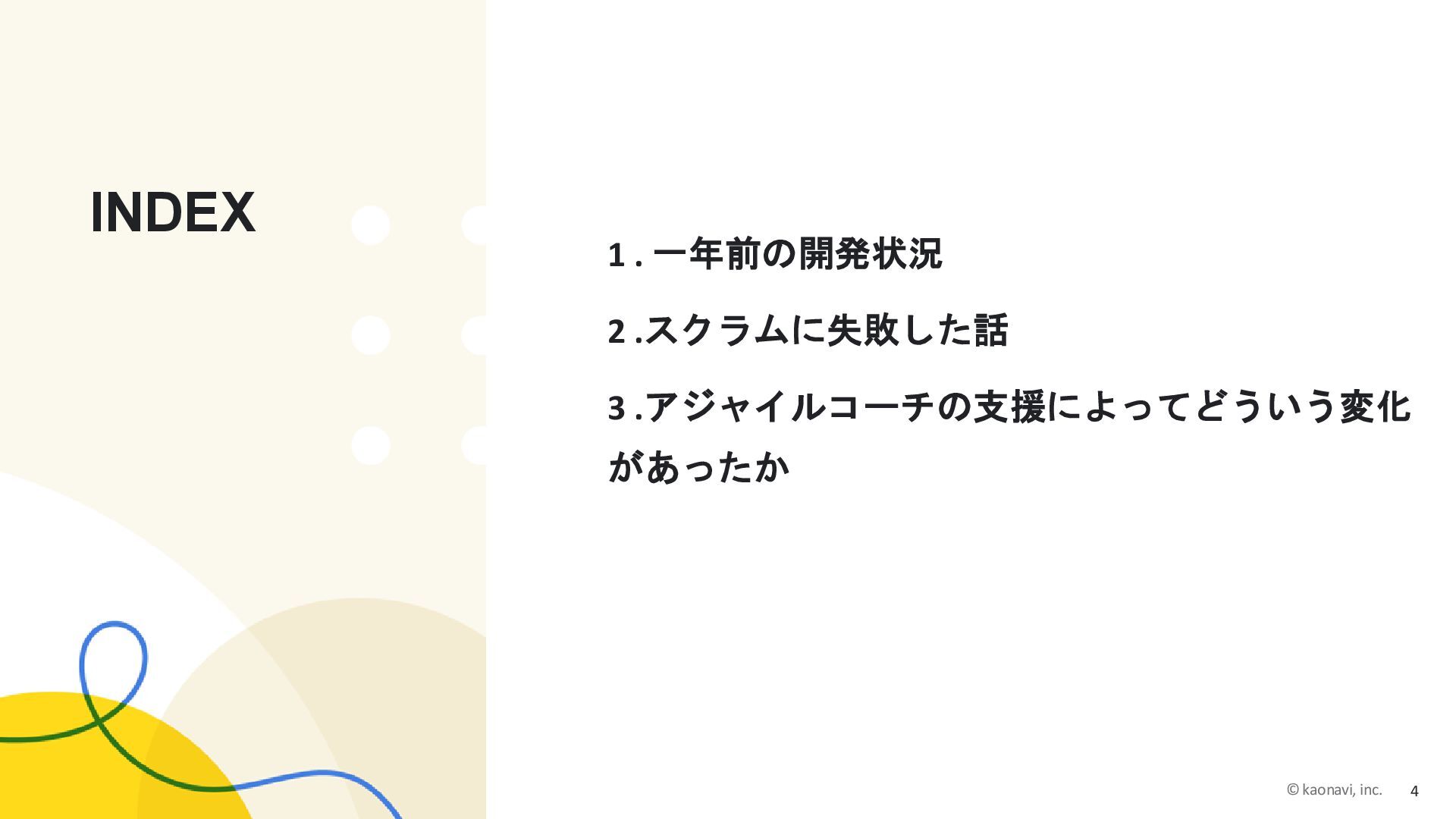 INDEX 1 . 一年前の開発状況 2 .スクラムに失敗した話 © kaonavi, inc. 4