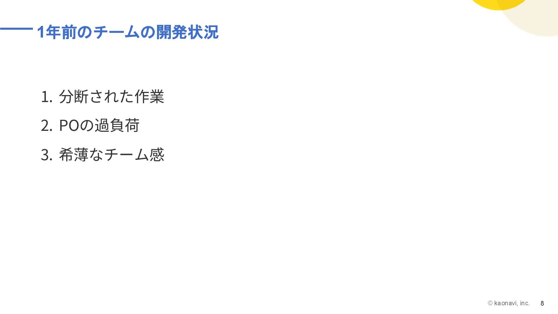 1年前のチームの開発状況 © kaonavi, inc. 8 1. 分断された作業 2. POの過負荷 3.