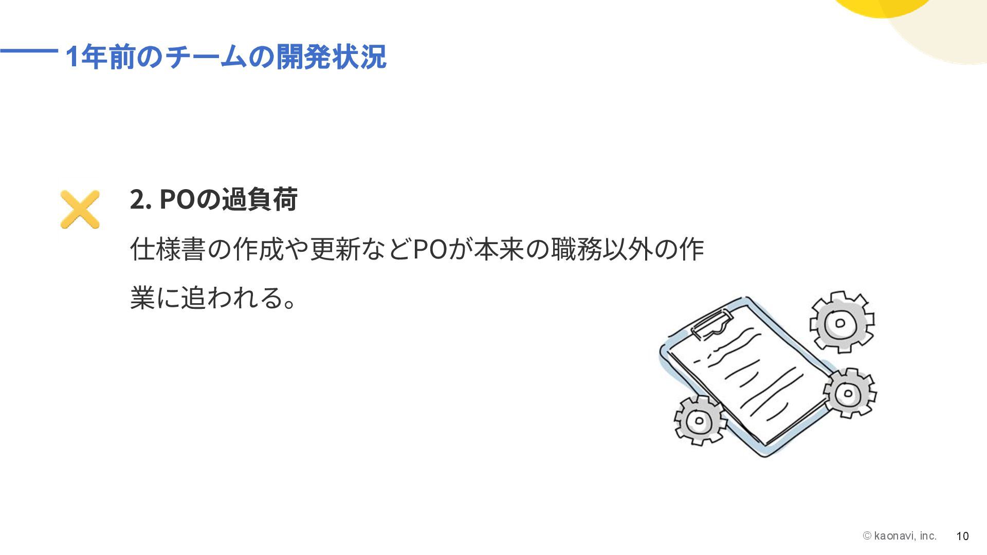1年前のチームの開発状況 © kaonavi, inc. 10 2. POの過負荷 仕様書の作成や更新などPOが本来の職務以外の作 業に追われる。