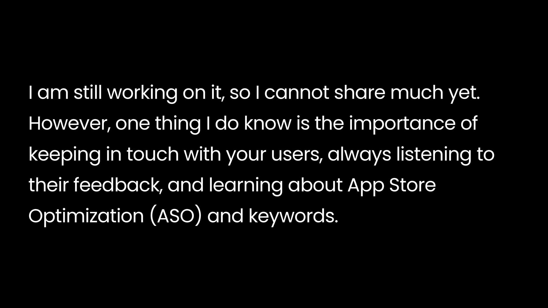 much yet. However, one thing I do know is the importance of keeping in touch with your users, always listening to their feedback, and learning about App Store Optimization (ASO) and keywords.