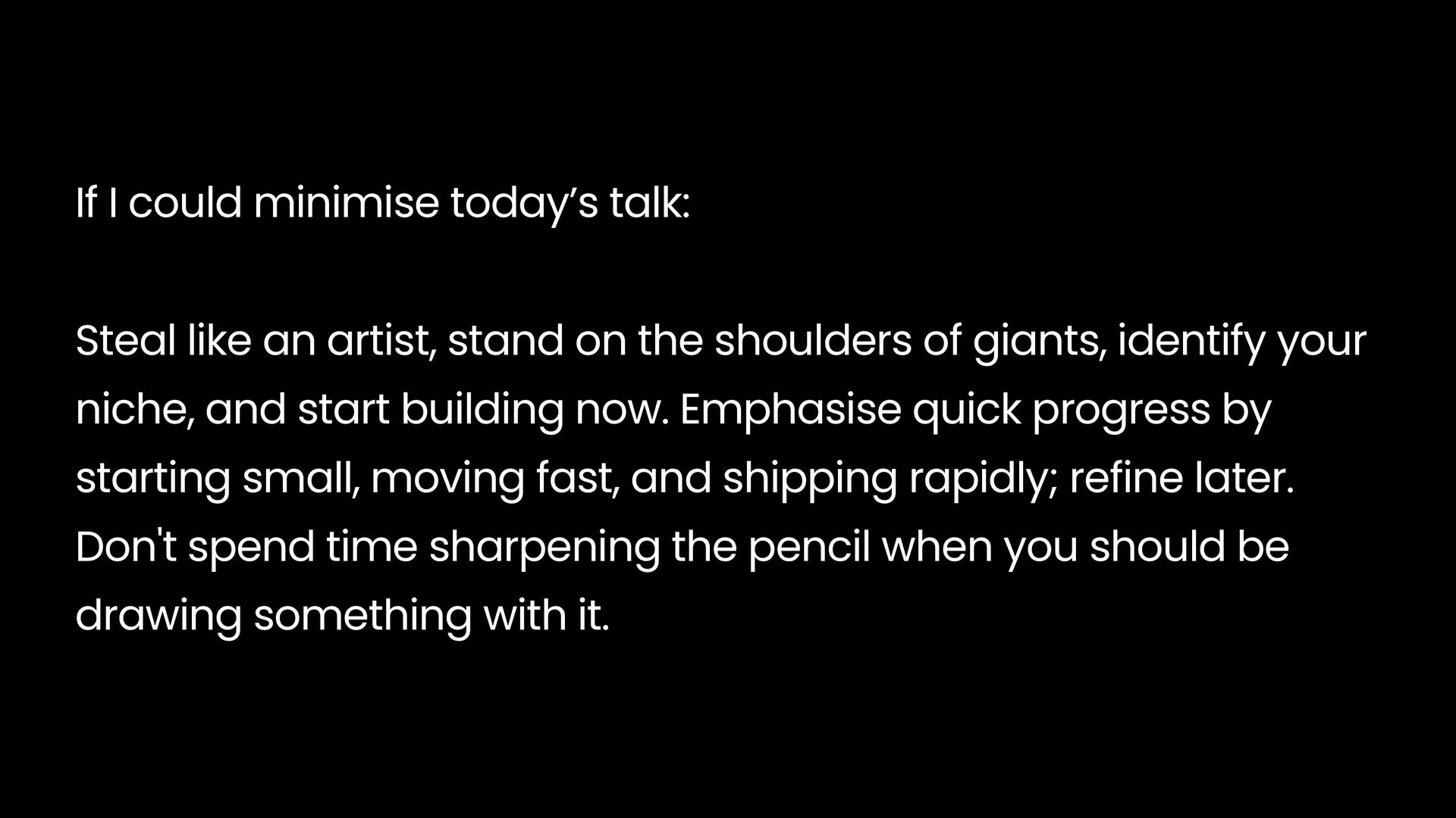 stand on the shoulders of giants, identify your niche, and start building now. Emphasise quick progress by starting small, moving fast, and shipping rapidly; refine later. Don't spend time sharpening the pencil when you should be drawing something with it.