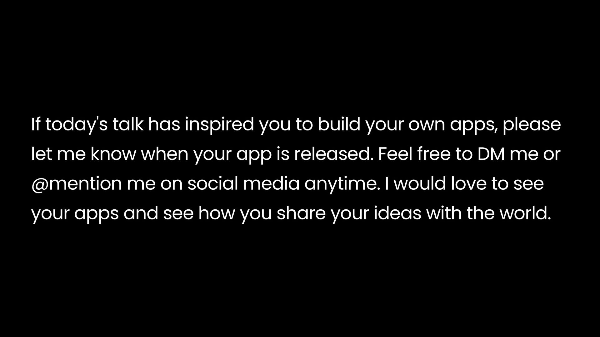 apps, please let me know when your app is released. Feel free to DM me or @mention me on social media anytime. I would love to see your apps and see how you share your ideas with the world.
