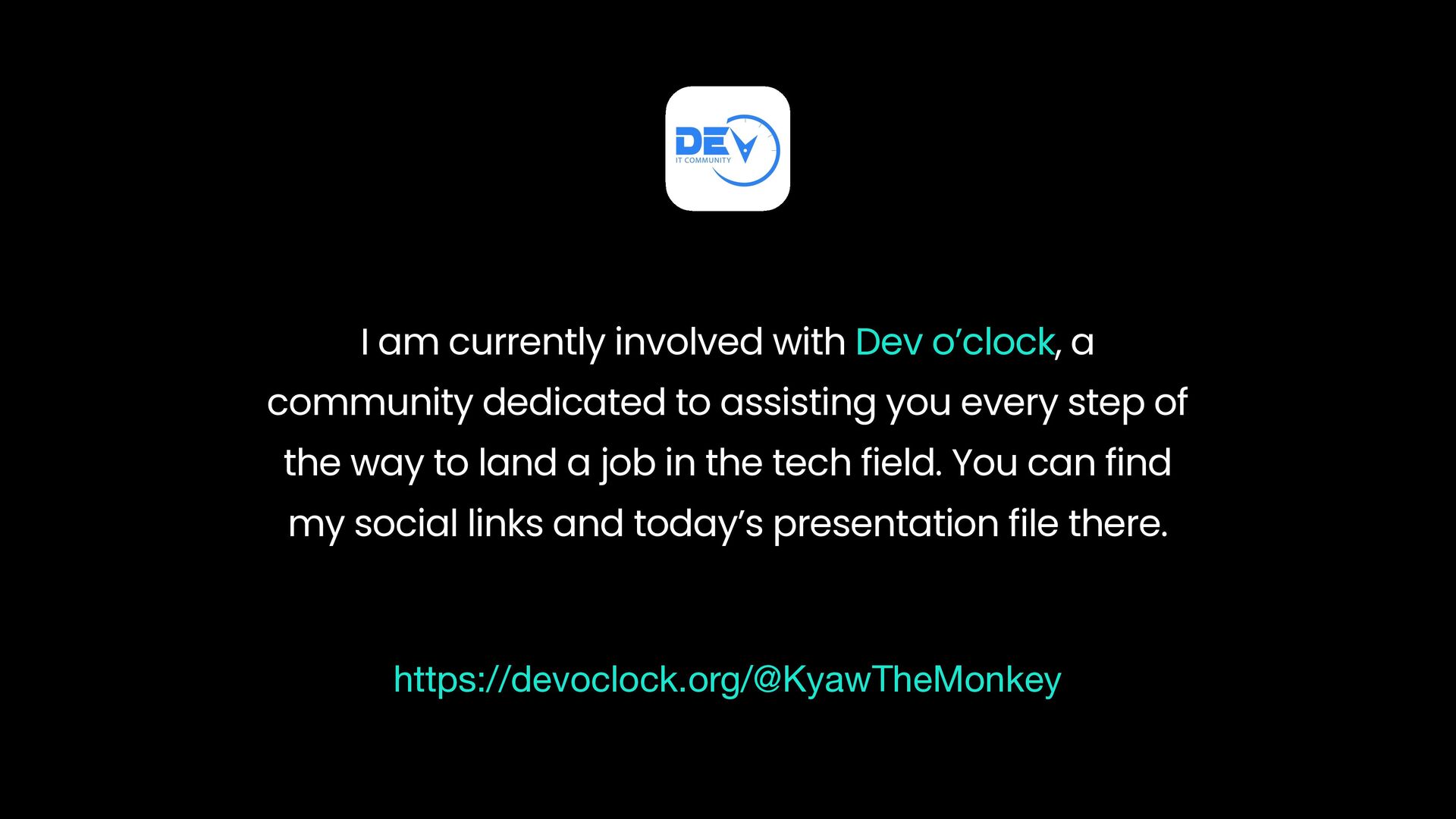 to assisting you every step of the way to land a job in the tech field. You can find my social links and today’s presentation file there. https://devoclock.org/@KyawTheMonkey