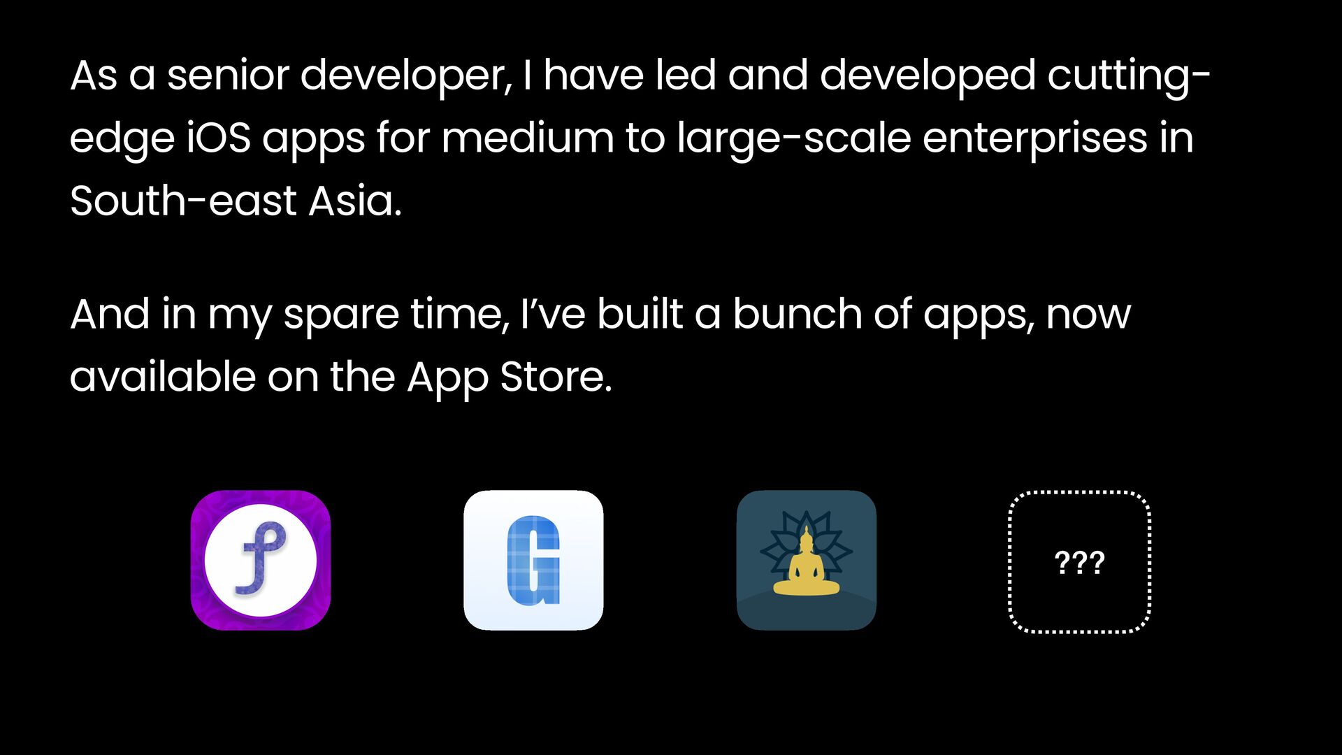 edge iOS apps for medium to large-scale enterprises in South-east Asia. And in my spare time, I’ve built a bunch of apps, now available on the App Store. ???