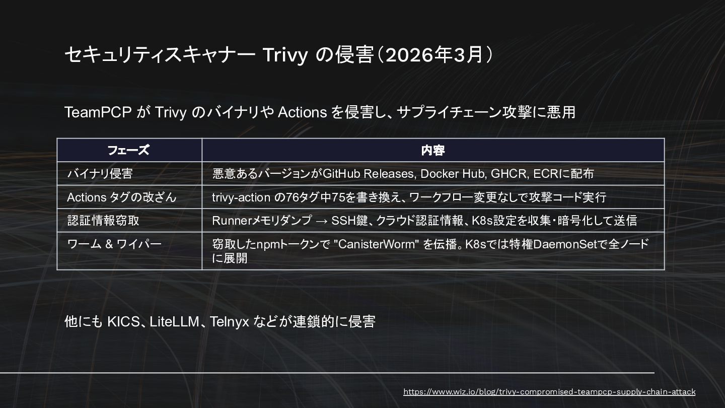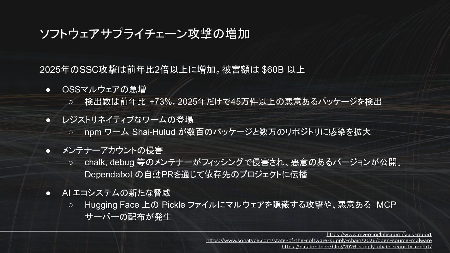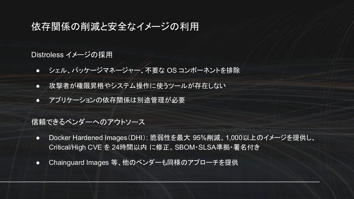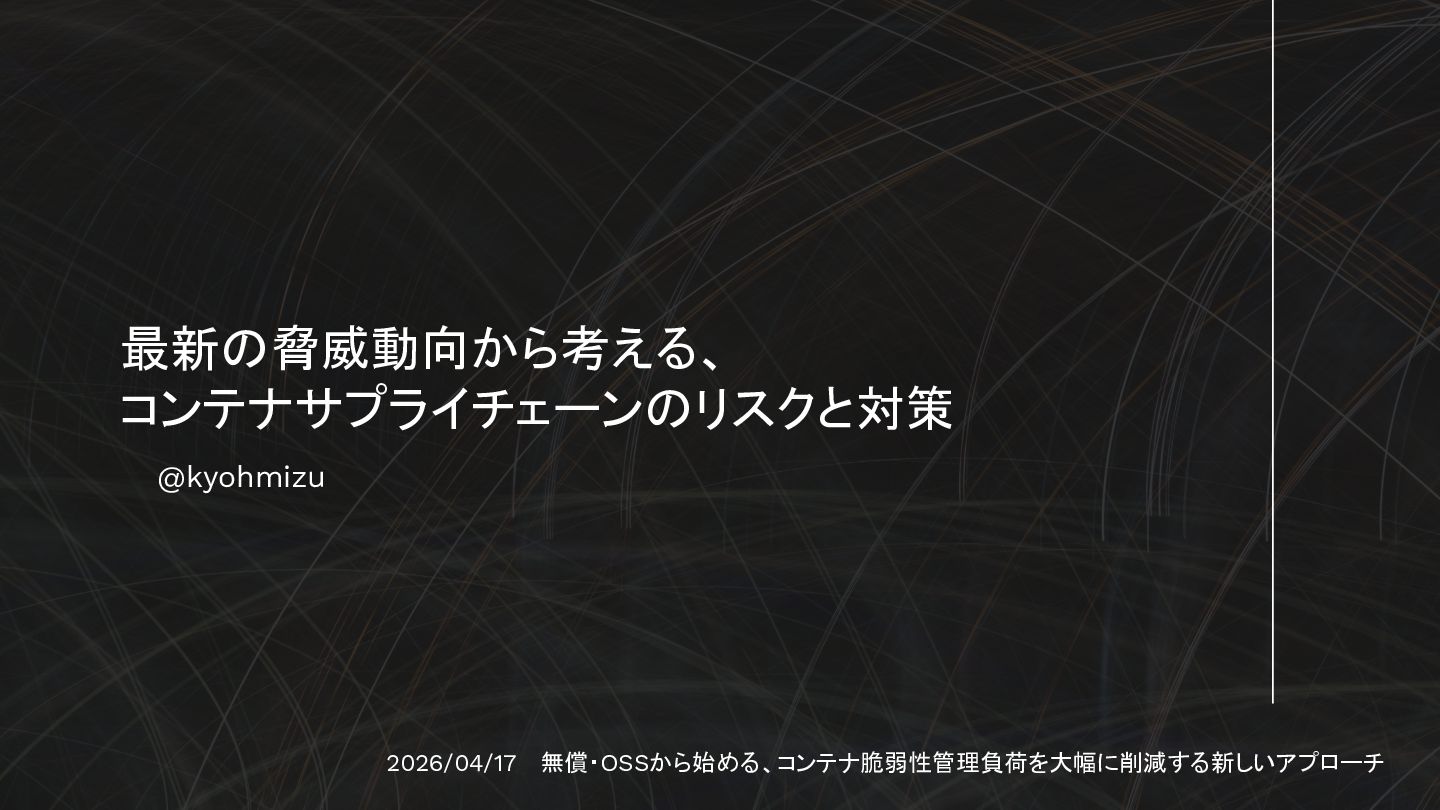 イベント登壇資料です。 2026/4/17 無償・OSSから始める、コンテナ脆弱性管理負荷を大幅に削減する新しいアプローチ https://dockerjapan.connpass.com/event/388164/