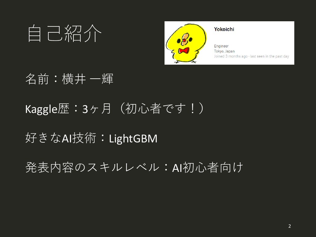 自己紹介 名前:横井 一輝 Kaggle歴:3ヶ月(初心者です!) 好きなAI技術:LightGBM 発表内容のスキルレベル:AI初心者向け 2