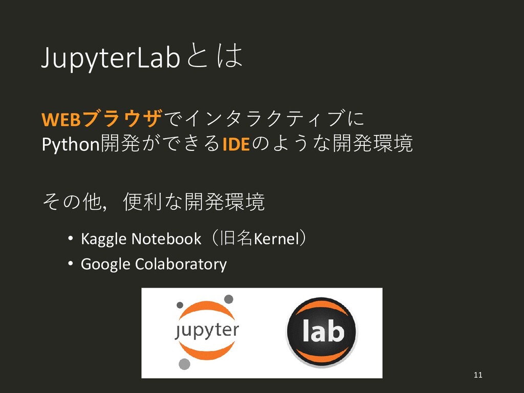 JupyterLabとは WEBブラウザでインタラクティブに Python開発ができるIDEのような開発環境 その他,便利な開発環境 • Kaggle Notebook(旧名Kernel) • Google Colaboratory