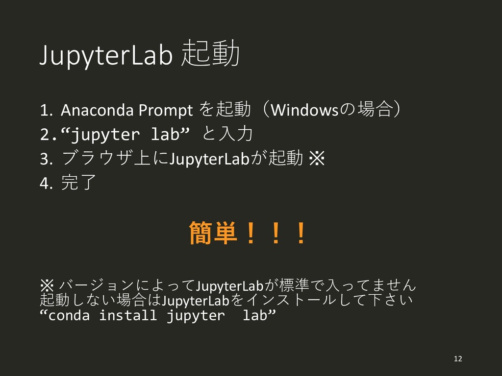 JupyterLab 起動 1. Anaconda Prompt を起動(Windowsの場合) 2.“jupyter lab” と入力 3.