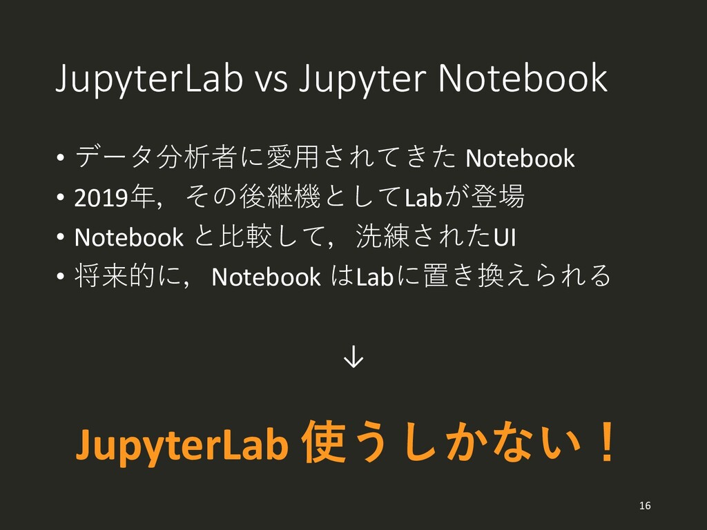 JupyterLab vs Jupyter Notebook • データ分析者に愛用されてきた Notebook • 2019年,その後継機としてLabが登場 •
