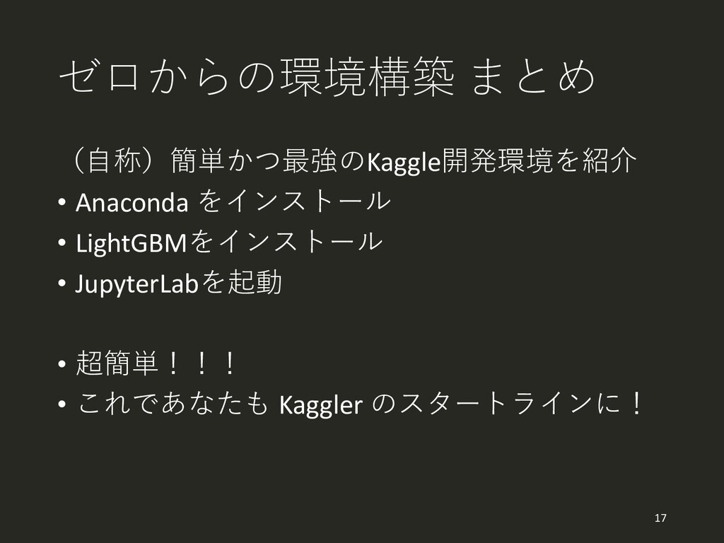 ゼロからの環境構築 まとめ (自称)簡単かつ最強のKaggle開発環境を紹介 • Anaconda をインストール • LightGBMをインストール • JupyterLabを起動