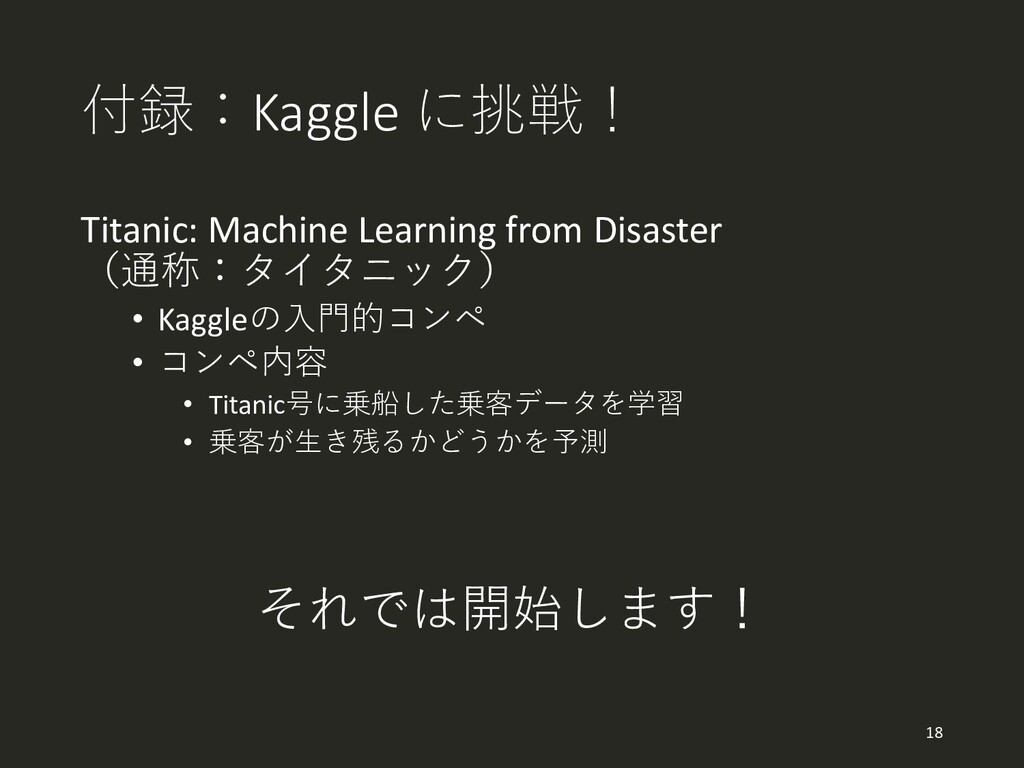 • 超簡単!!! • これであなたも Kaggler のスタートラインに! 17