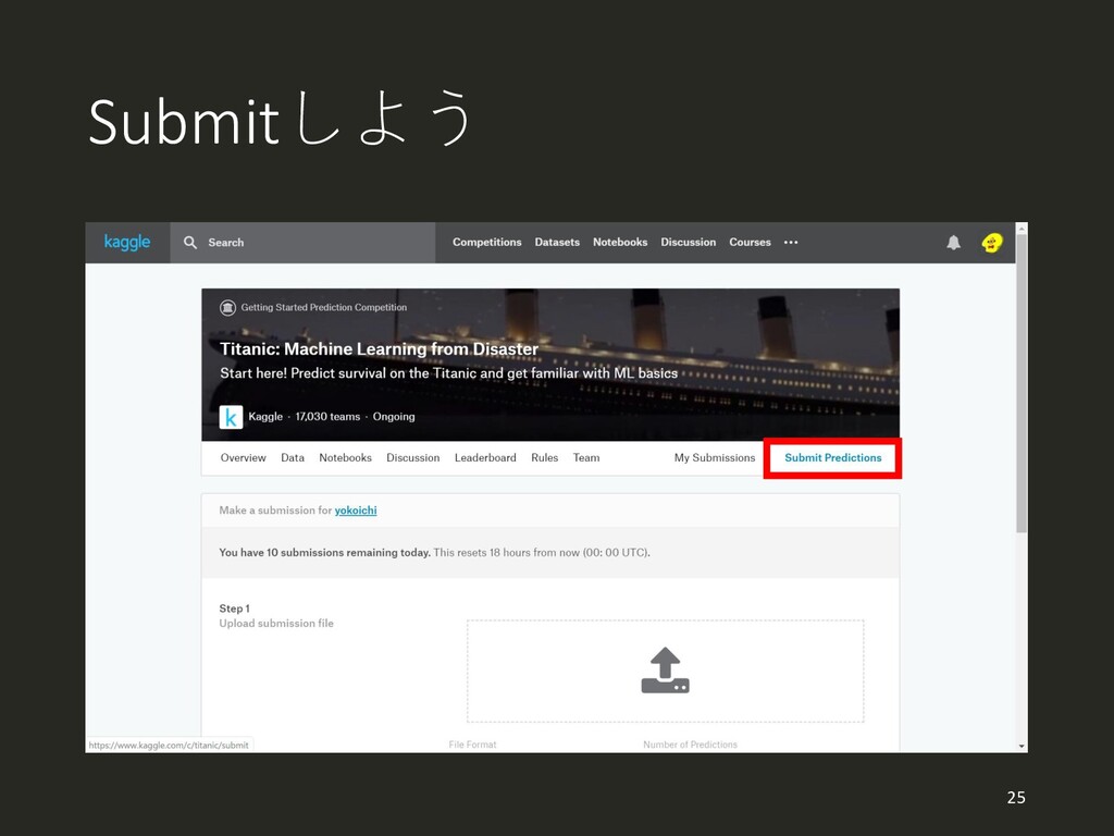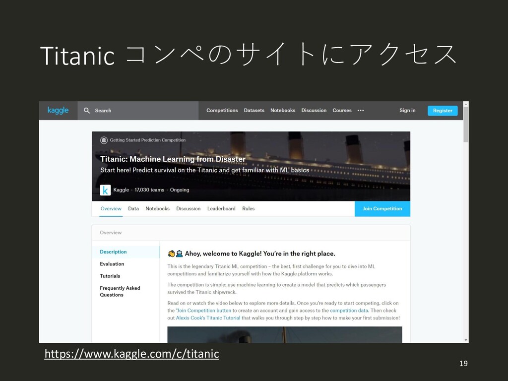 Titanic コンペのサイトにアクセス https://www.kaggle.com/c/titanic 19