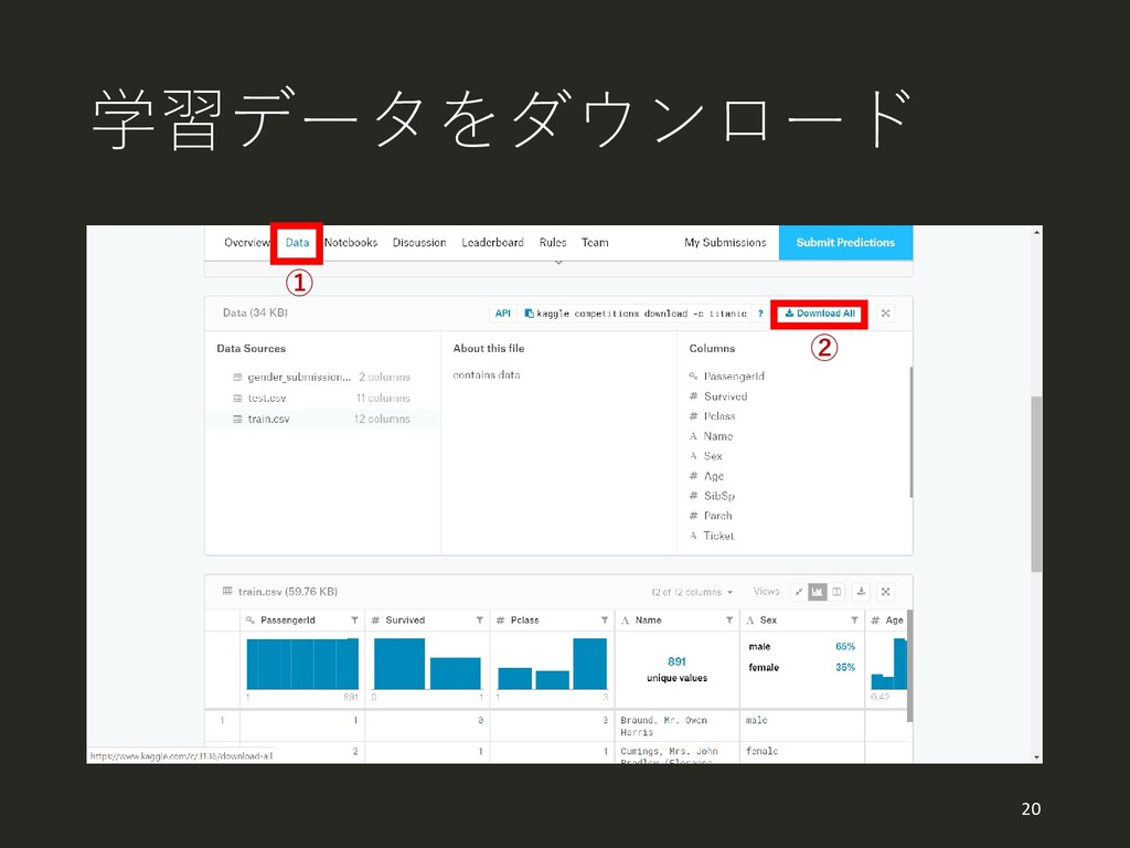学習データをダウンロード ① ② 20