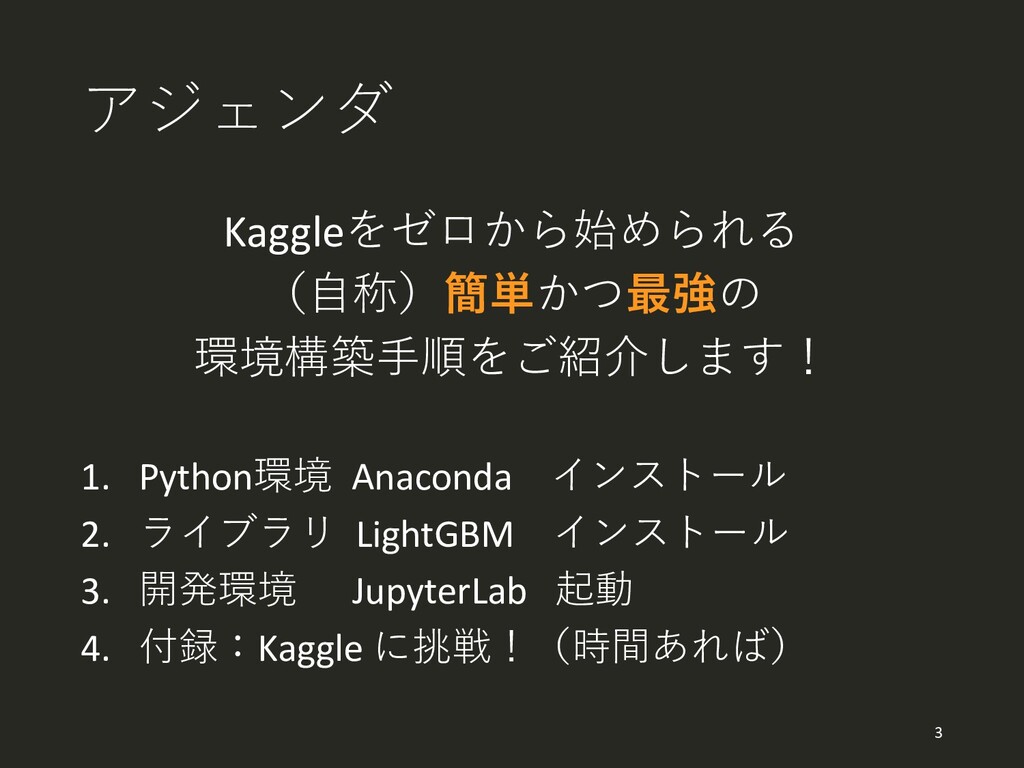 アジェンダ Kaggleをゼロから始められる (自称)簡単かつ最強の 環境構築手順をご紹介します! 1. Python環境 Anaconda インストール 2. ライブラリ