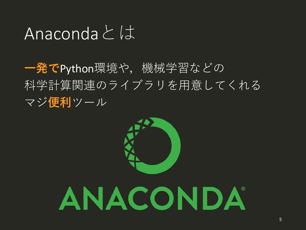 Anacondaとは 一発でPython環境や,機械学習などの 科学計算関連のライブラリを用意してくれる マジ便利ツール 5