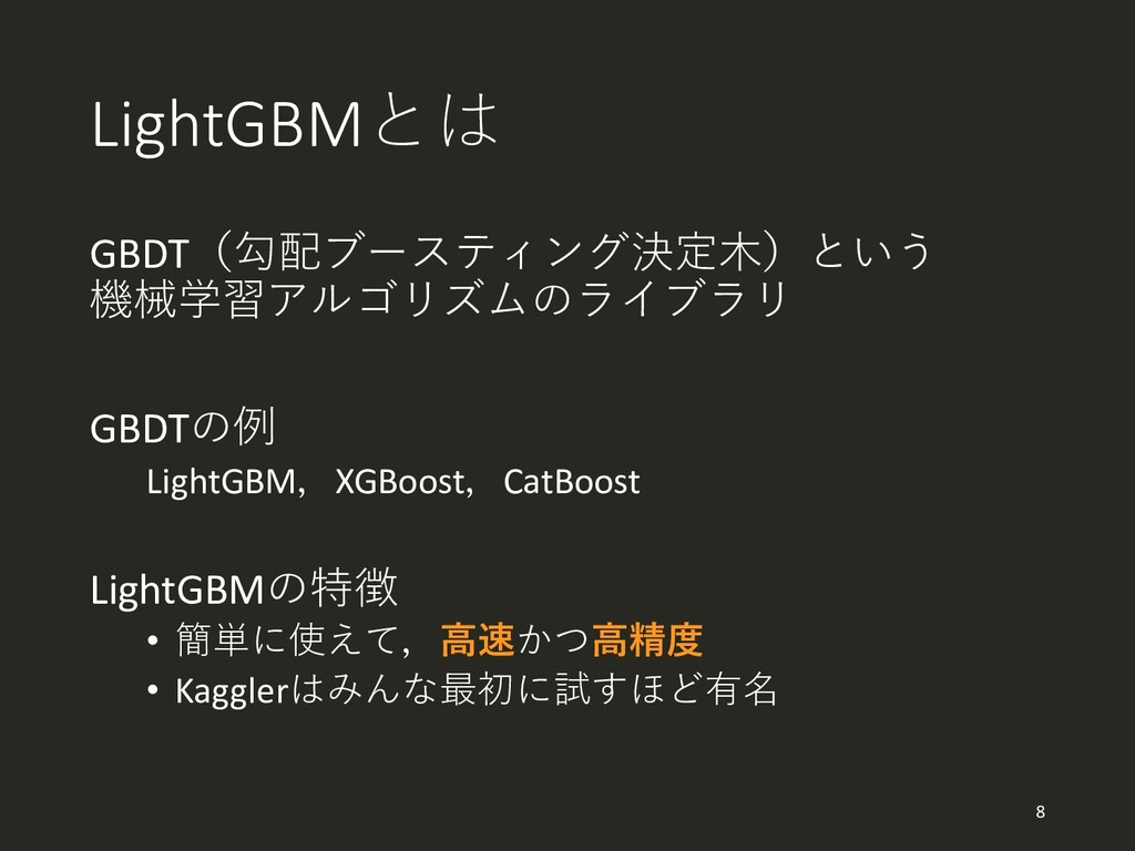 LightGBMとは GBDT(勾配ブースティング決定木)という 機械学習アルゴリズムのライブラリ GBDTの例 LightGBM,XGBoost,CatBoost LightGBMの特徴 • 簡単に使えて,高速かつ高精度 • Kagglerはみんな最初に試すほど有名