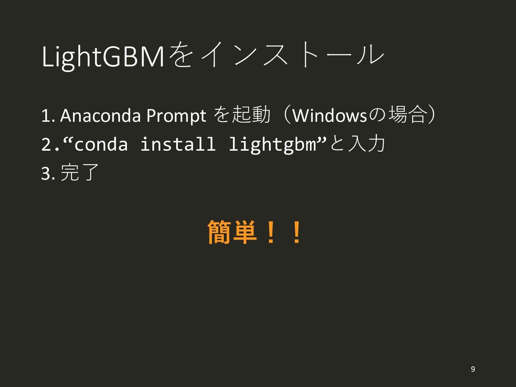LightGBMをインストール 1. Anaconda Prompt を起動(Windowsの場合) 2.“conda install lightgbm”と入力 3. 完了