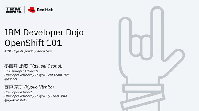 Developer Advocate Developer Advocacy Tokyo Client Team, IBM @osonoi ⻄⼾ 京⼦ (Kyoko Nishito) Developer Advocate Developer Advocacy Tokyo City Team, IBM @KyokoNishito #IBMDojo #OpenShiftWorldTour