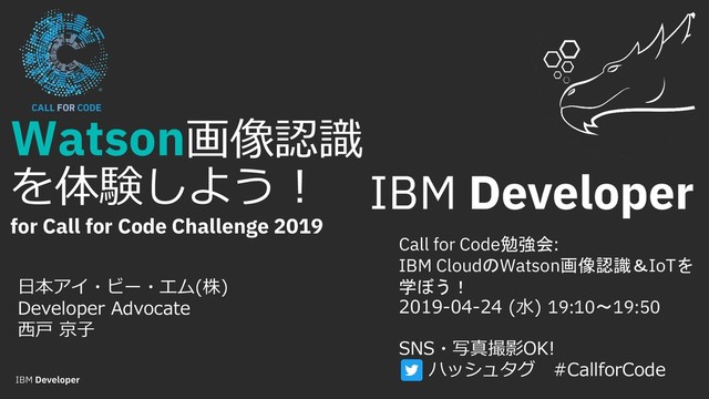 2019-04-24 (水) Call for Code勉強会: IBM CloudのWatson画像認識&IoTを学ぼう!のセッション 「Watson画像認識を体験しよう for Call for Code Challenge 2019」の資料です。