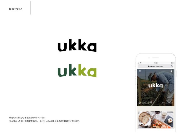 「ukka(ウッカ)」は株式会社ukkaが運営する一次産業のD2Cプラットフォームです。2019年9月にサービス名を「OWNERS」から「ukka」へ変更した際に行ったロゴリニューアルの、完成前ドラフト案(一部)です。